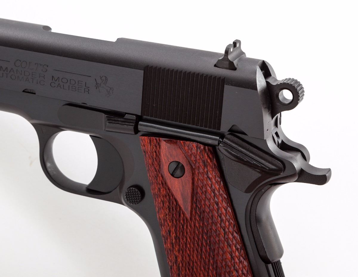 Colt MK IV Series 80 Commander Model Semi-Automatic Pistol, #CJ32494, .45 ACP cal., 4-1/4'' barrel, blue finish, checkered diamond pattern wood grips, with white 3-dot sight system. In original blue plastic hard case with matching end label, Colt hang tag, owner's manual and associated paperwork. Includes two factory 8-round magazines. Dating from the mid-1990s. Condition is excellent, appearing as new, showing very little, if any, use, with some dried original preservative on the surface. Est.: $1,000-$1,500. (Modern/PPT) (Consecutive to above lot.)