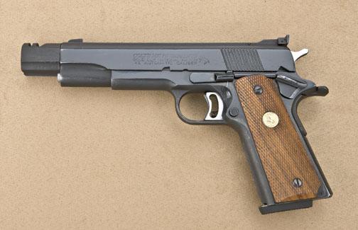 Colt MK IV Series ’70 Gold Cup National Match semi-auto pistol, .45 cal., 6-1/4” barrel including a 1-1/4” ported muzzle extension; black finish, checkered Colt medallion wood grips, Colt factory wood grained cardboardbox with insert and end label numbered to this gun, #70N80928. This gun is in overall excellent condition showing approx. 97% original finish, fine bore, crisp action, sharp markings and fine grips; customizedlightened adjustable trigger, Elliason adjustable rear sight, Pachmayr weighted competition magazine; box is in overall good to very good condition with some wear and scuffing. Est.: $600-$1,250.