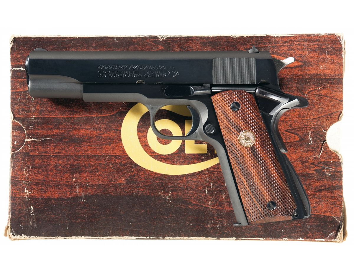 Manufactured in 1982. The slide stop, trigger, magazine release, hammer, thumb safety and arched mainspring housing are serrated. With Colt "wood grain" box numbered to gun.