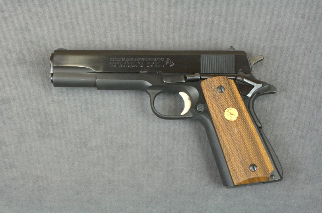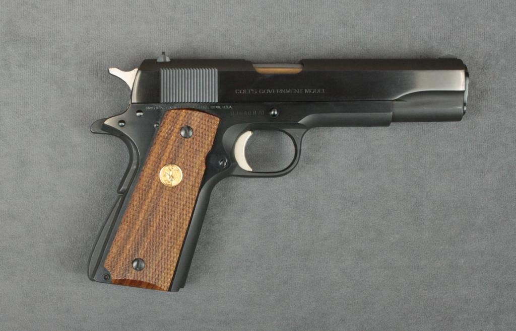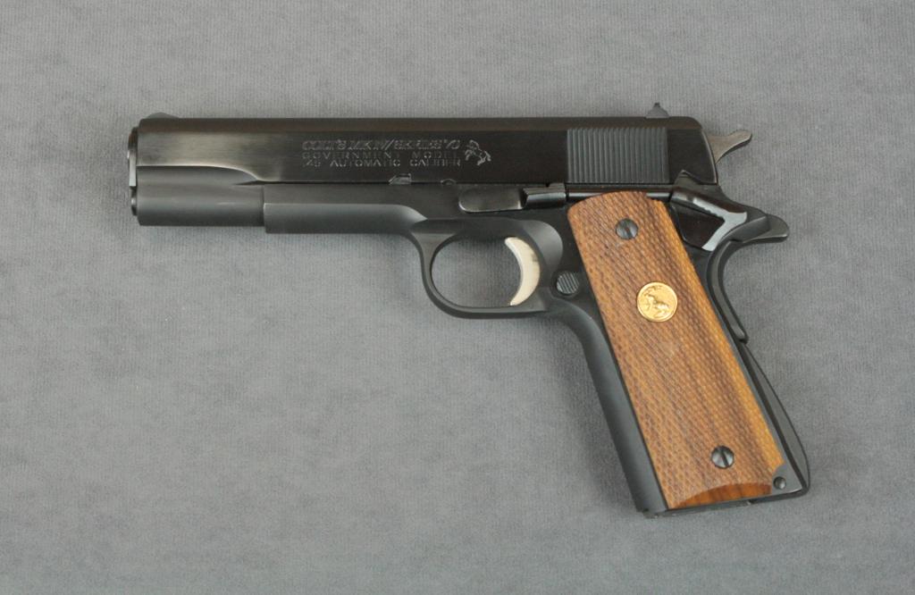 Colt MK IV Series ’70 Government Model  semi-auto pistol, .45 cal., 5” barrel,  checkered Colt medallion wood grips,  #03640B70. This gun is in overall like new  condition showing little handling or use with approx. 99% original finish, mirror bore,  crisp action, sharp markings and grips.   Est.:  $500-$900.