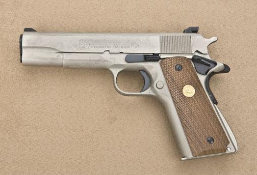 Colt MK IV Series 70 Government Model semi-auto pistol, .45 cal., 5” barrel, satin finish stainless steel, checkered Colt medallion wood grips, #30179B70. This gun is in overall excellent condition showing somescattered handling scratches and storage marks, fine bore, crisp action, sharp markings and excellent grips; trigger, safeties, slide release and barrel bushing are black finish accented. Est.: $450-$850.