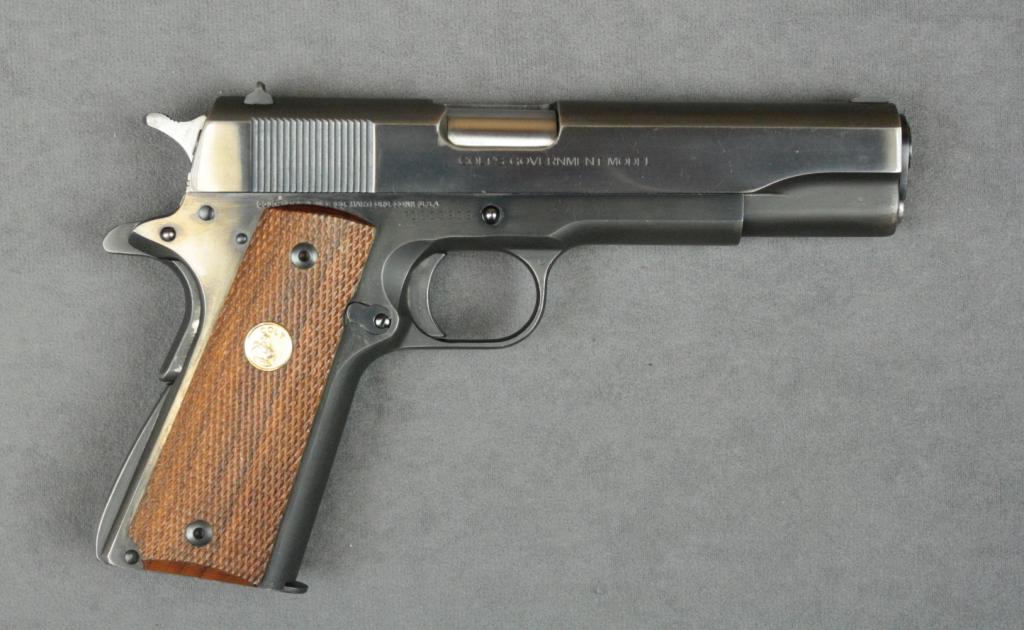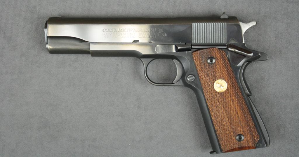 Colt MK IV/Series ’70 semi-auto pistol, .45 cal., 5” barrel, black finish, checkered medallion wood grips, #70B33905. This gun is in overall excellent condition showing the majority of its original finish, fine bore,action, markings and grips. Est.: $600-$1,200.