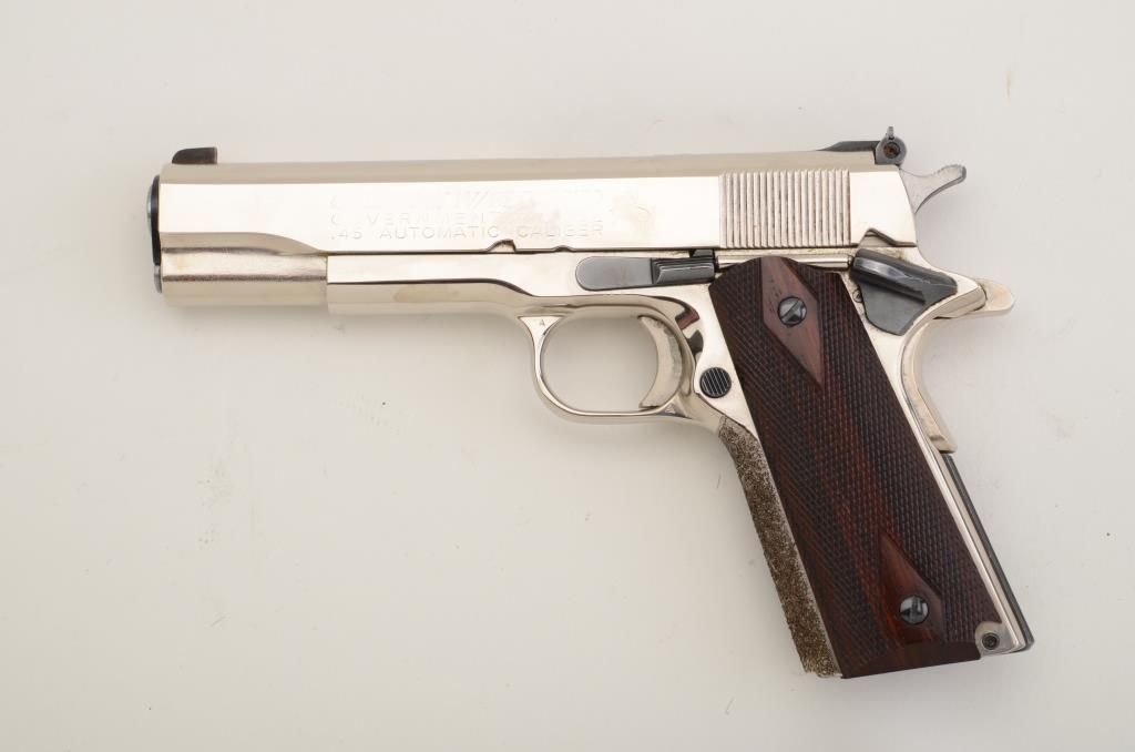 Colt MK IV/Series’70 semi-auto pistol, .45 cal., 5” barrel, nickel finish, no magazine, stippled f