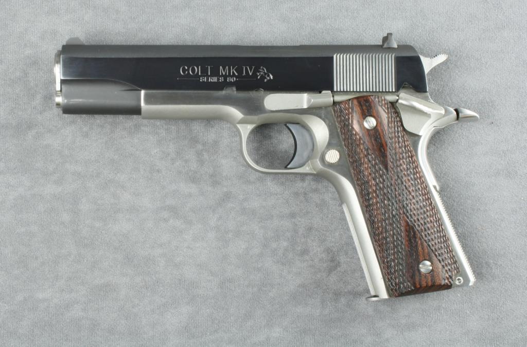Colt MK IV Series 80 Combat Elite Model semi-auto pistol, .45 cal., 5” barrel, black finish to slide, brushed finish to stainless steel frame, checkered wood grips, #CG14377. This gun is in overall fine to excellentcondition showing the majority of original finish, fine bore, action, marking and grips. Est.: $750-$1,500.