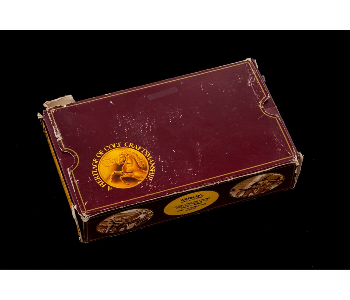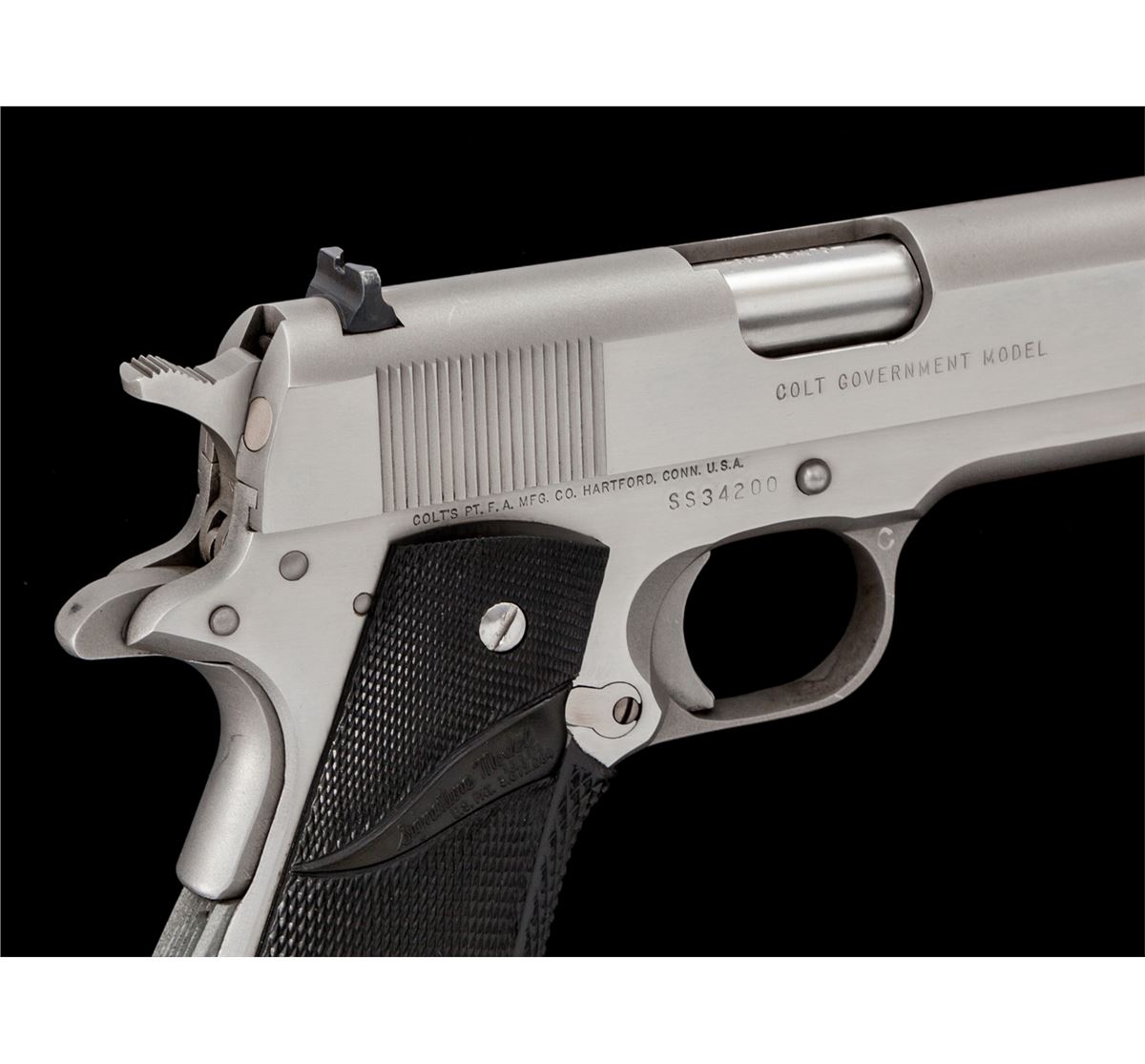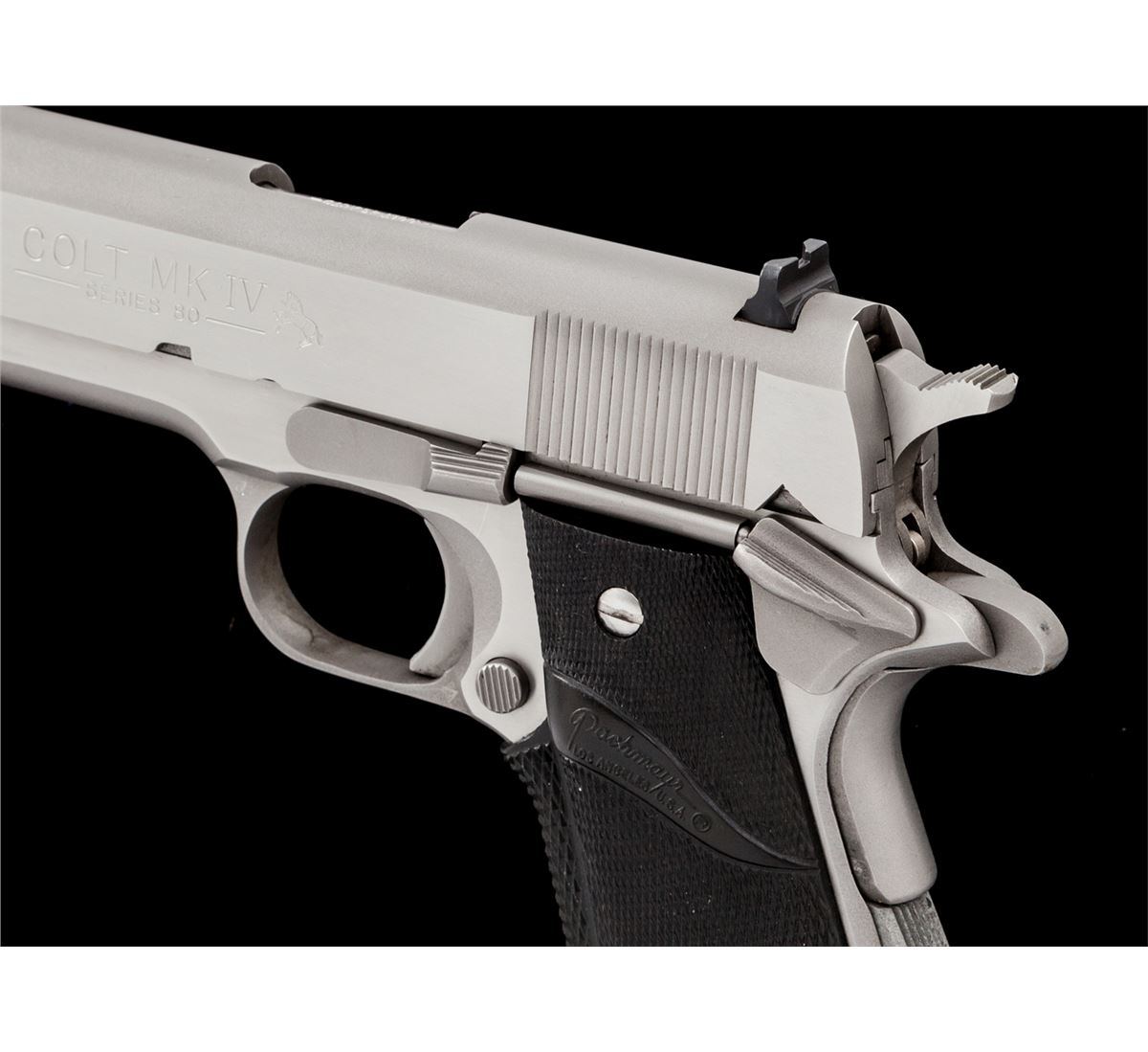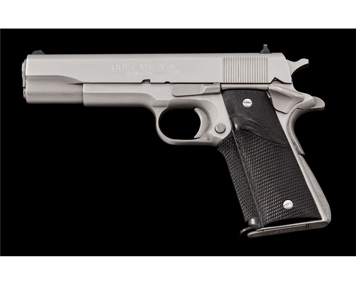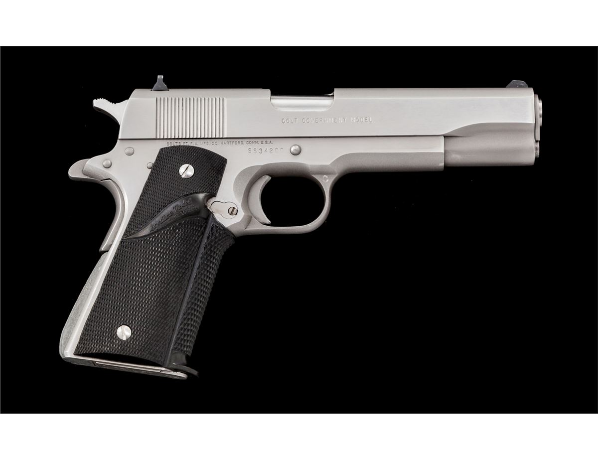 Colt MK IV Series 80 Government Model, #SS34200, .45 ACP cal., 5'' barrel, stainless steel, wraparound Pachmayr black rubber grips, with one stainless steel magazine, in original box, no instructions or hang tag. Condition is excellent showing little use with minor reassembly scratches. Original box with moderate tattering and tape repair. Est.: $800-$1,200. (Modern/PPT)
