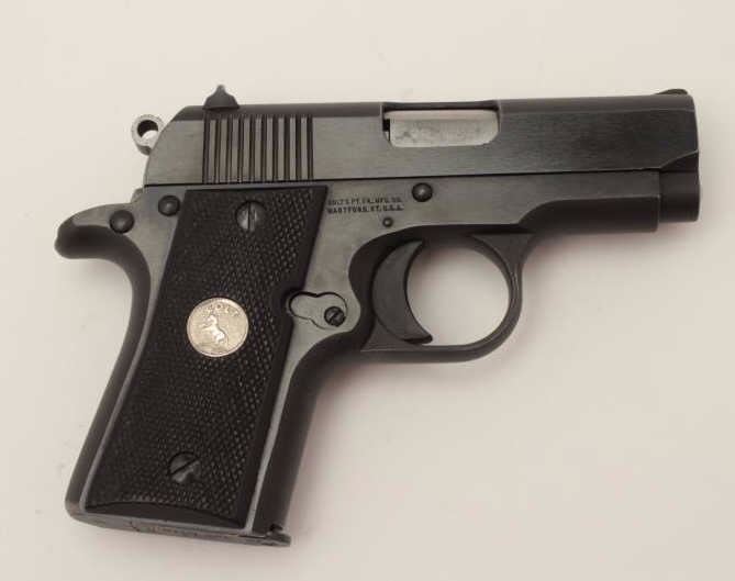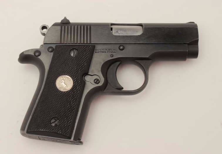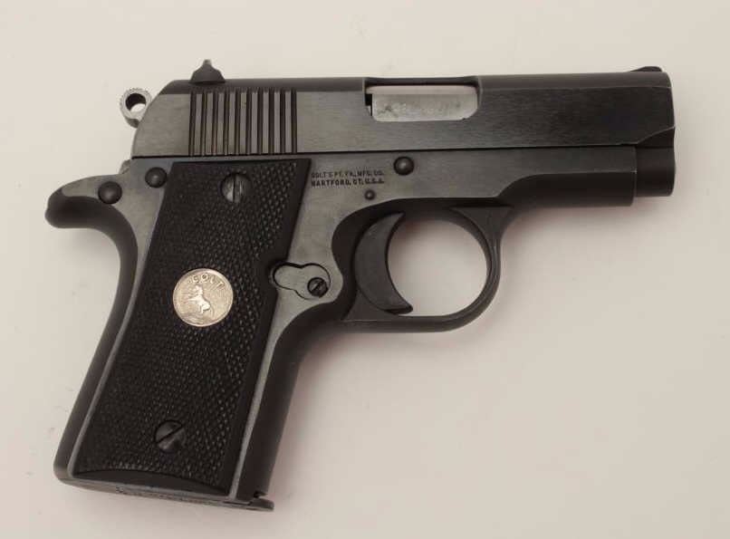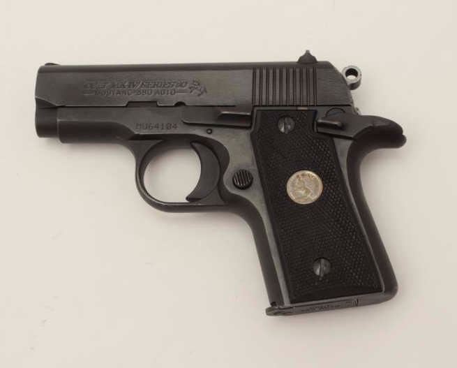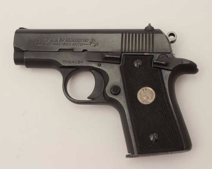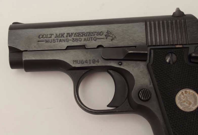 Colt MK IV/Series 80 Mustang Model semi-automatic pistol, .380 Auto caliber, 2.75” barrel, steel frame, checkered black medallion grips, S/N MU64104, accompanied by 2 extra magazines. This gun is in overallexcellent condition showing little handling. (Modern/PPT). Est.: $600-$1,200.