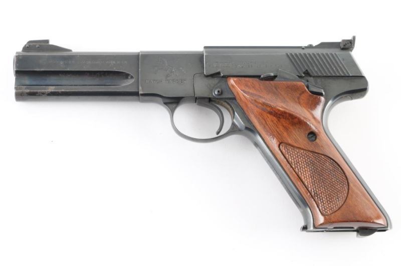 Pistol. Semi-Automatic. 10-rd magazine. Third series, Woodsman(1955-1977) This one manufactured 1972. 4.5" barrel. Pinned blade to serrated ramp, and adjustable Elliason notch sights. Heel magazine release, Serrated fore, and backstrap. Blued finish. Standard markings. Checkered walnut grips with right thumb rest, Slide action is smooth/tight. Bore is very good, but a little dirty. Grips are very good with some edge wear/dings. Blued finish is about 75% with minor edge wear/scratches. There is some pitting, mostly to the left side of the barrel. Comes with one Colt marked magazine. NRA Condition-Good. Modern Firearm.