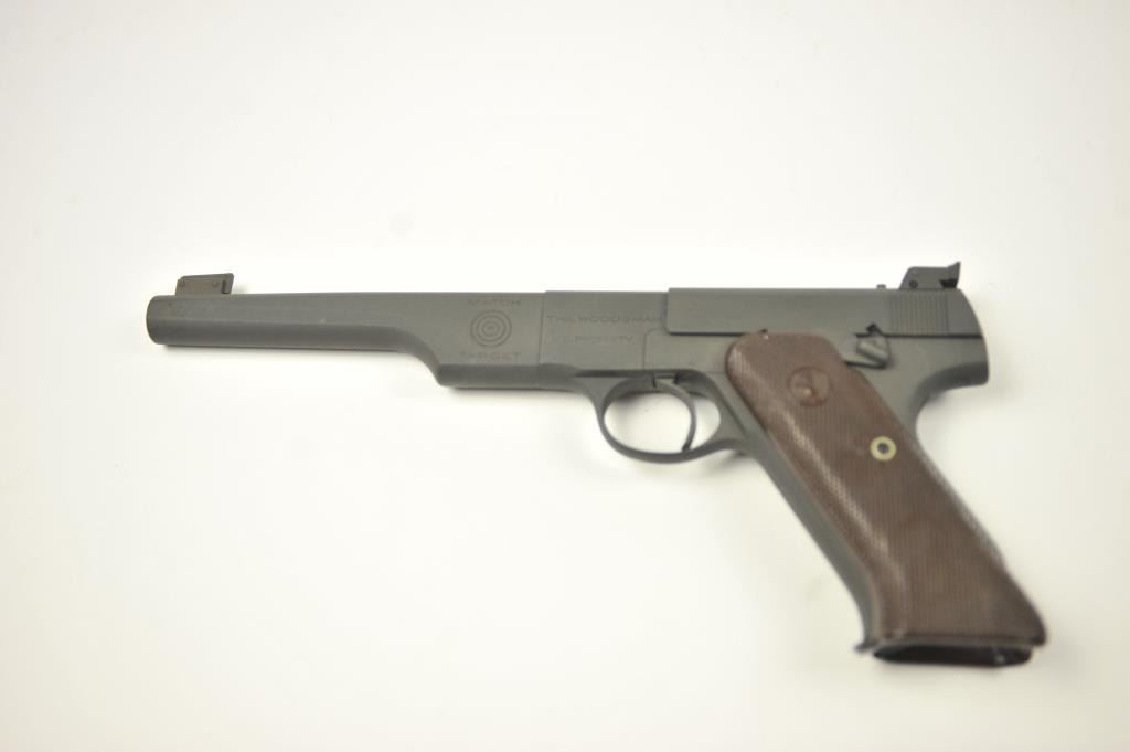 Colt Match Target Woodsman U.S. Property and Navy marked with parkerized finish and extended Colt grips, Serial #15351. The ordnance wheel is also lightly stamped on the left rear of the frame. The pistol is infine to excellent original condition with a blued Woodsman marked magazine. 98-99%+ original finish and the grips are also fine to excellent. A 9.8-9.9 on a scale of 1-10, showing very minor use and slight handling.Provenance: “Bob Settani Collection”. Est.: $2,500-$5,000. (C+R/PPT).