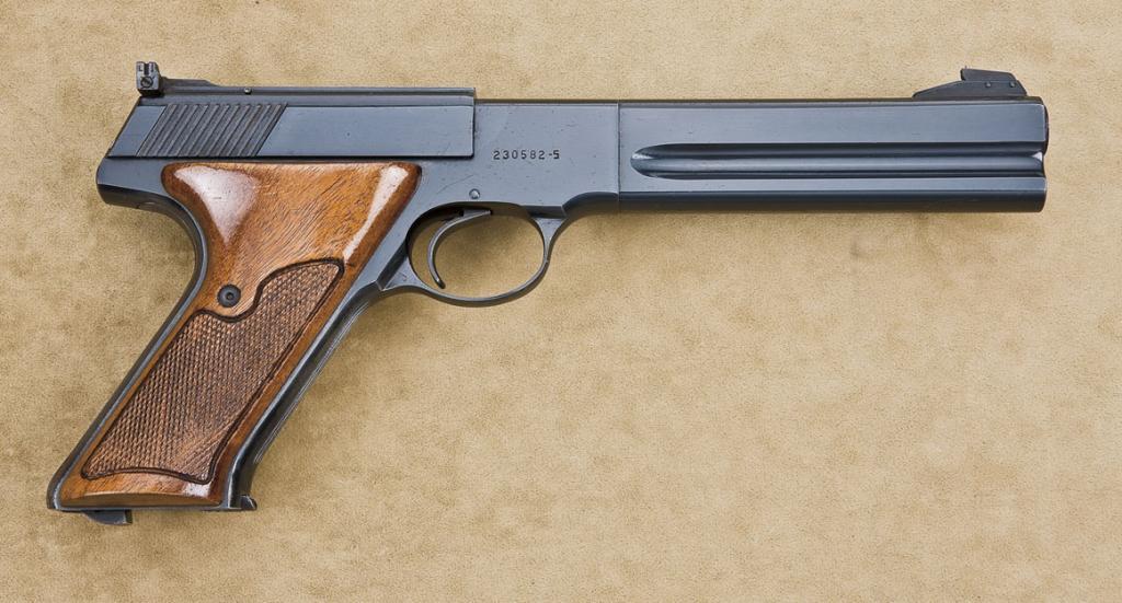 Colt Match Target semi-auto pistol, .22 LR cal.,6” barrel, blue finish, checkered thumb rest wood grips, #230582-S. This gun is in overall fine condition showing approx. 99% original finish with just the slightest high point wear, fine bore, crisp action, sharp markings and fine grips with just a couple of small mars; target sights. Est.: $500-$1,000.