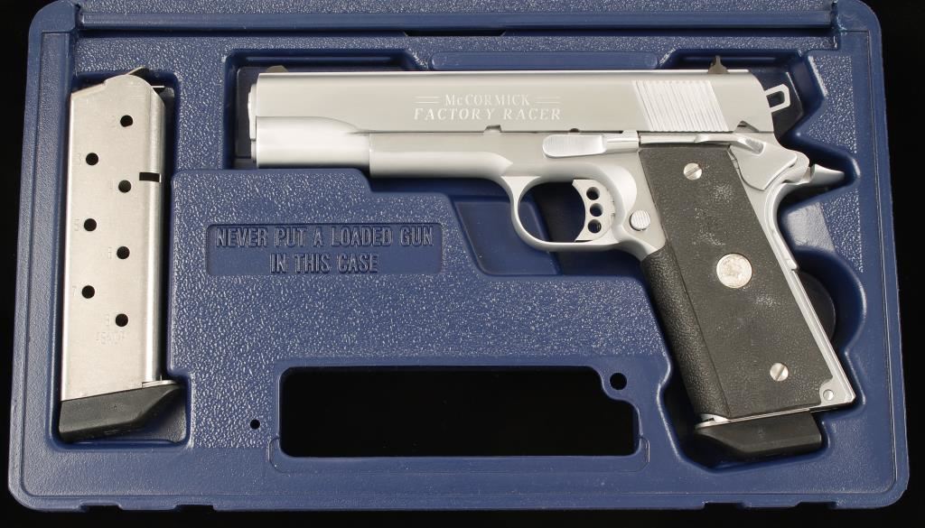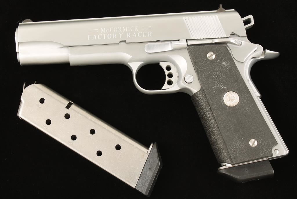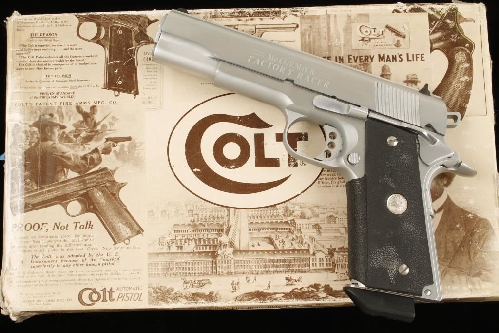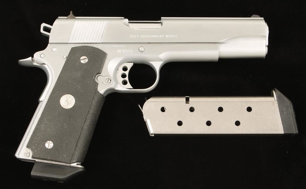 Chrome single-action semi-automatic pistol with a 5" barrel and two magazines in factory boxes. 1911A1 from the Colt Custom Shop. Chrome finish is near perfect. Bore is shiny with sharp rifling. Function is very good with long trigger (with overtravel adjustment), skeleton hammer and beavertail grip safety. Wrap around rubber grips are in fine shape. Comes in plastic case with documents and packing materials and the protective cardboard sleeve. Condition is excellent. *Modern Firearm*