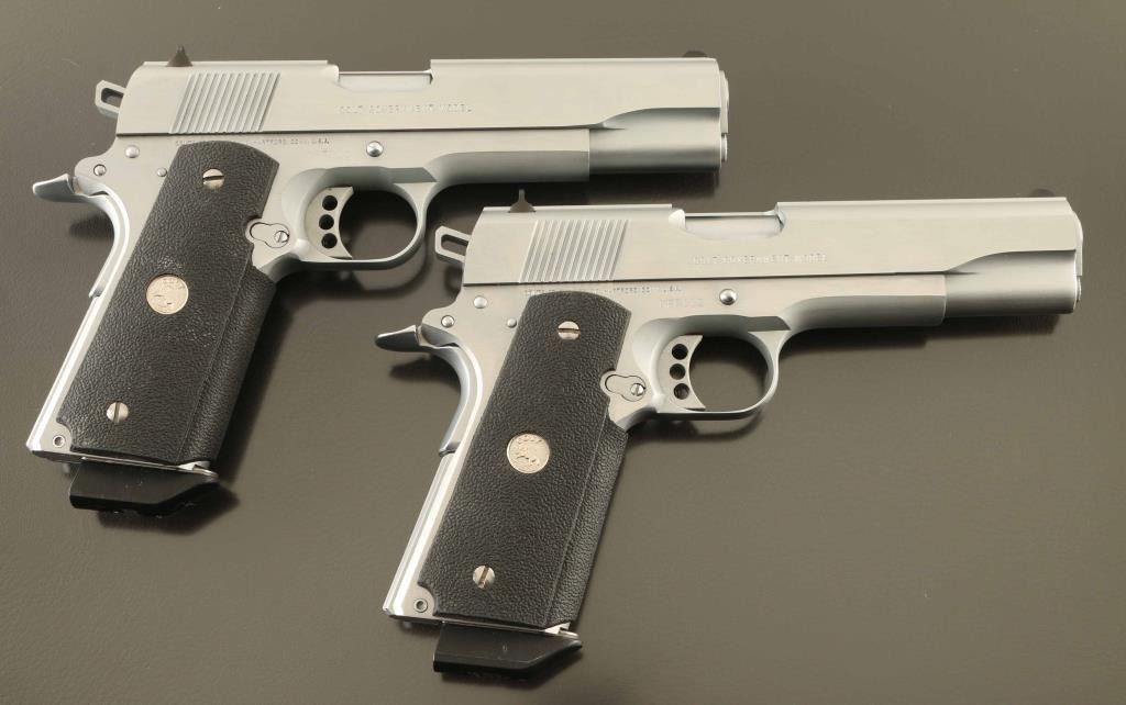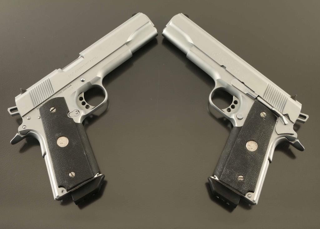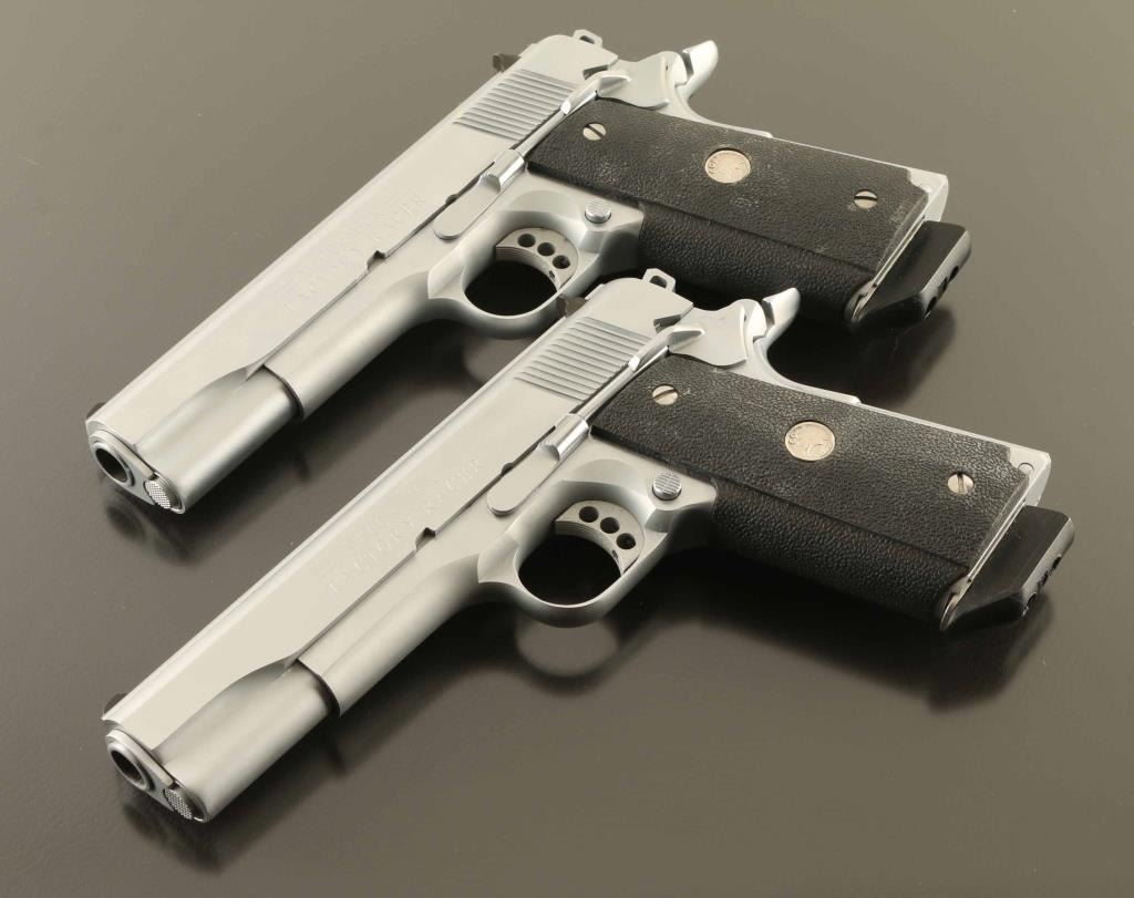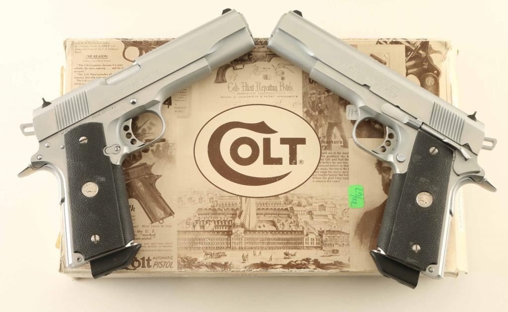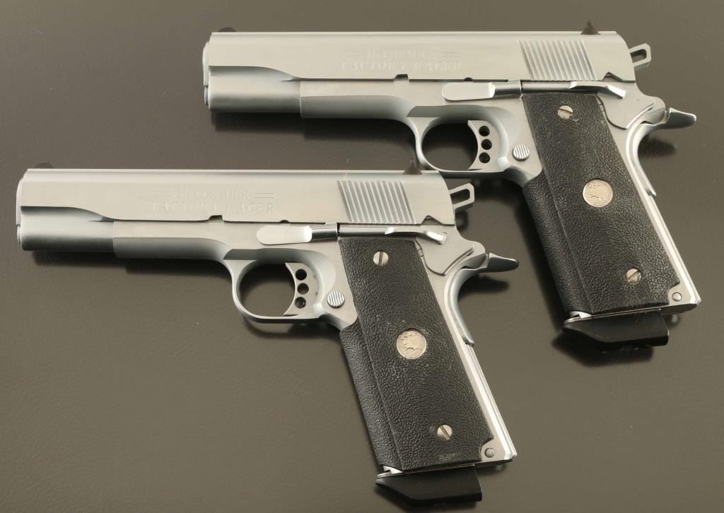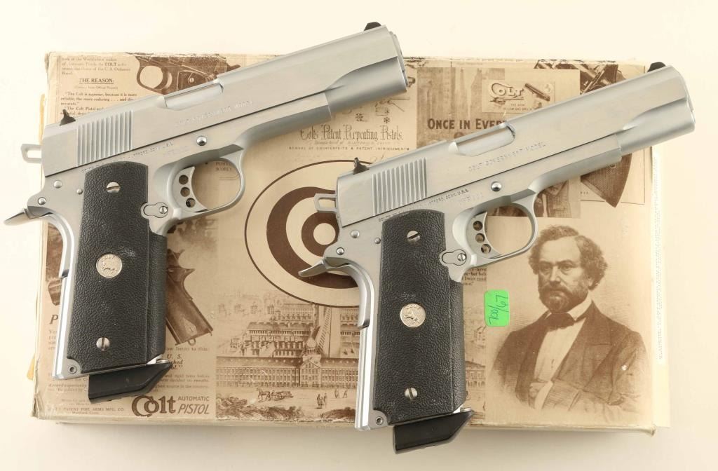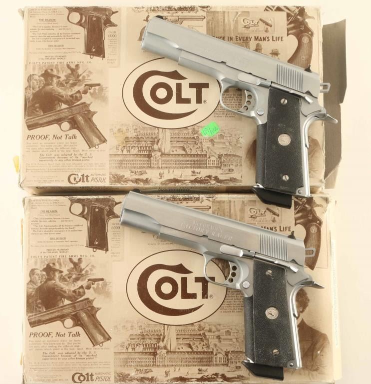 Consecutive serial numbered pair of Colt Government Model 'McCormick Factory Racer' .45 ACP Pistols SNs: MFR111 & MFR112. Pistols feature stainless steel construction, 5" barrels, three dot sights (front sight staked, rear in dovetail), square shaped ring type hammers, flat beavertail grip safeties, extended manual safeties, flat serrated mainspring housings, wrap-around black rubber grips with nickeled Colt logos. Condition is excellent, with few signs of handling and use, some dirt or grime on grips, some slight scuffing to sides of slides. Both pistols include (1) magazine with bumper pad, factory paperwork and blue plastic box, fair condition cardboard sleeves for the boxes. Condition is NRA Excellent *** Modern Firearms ***