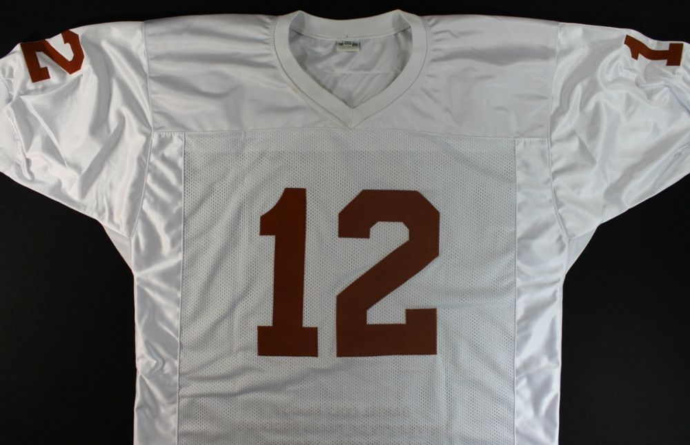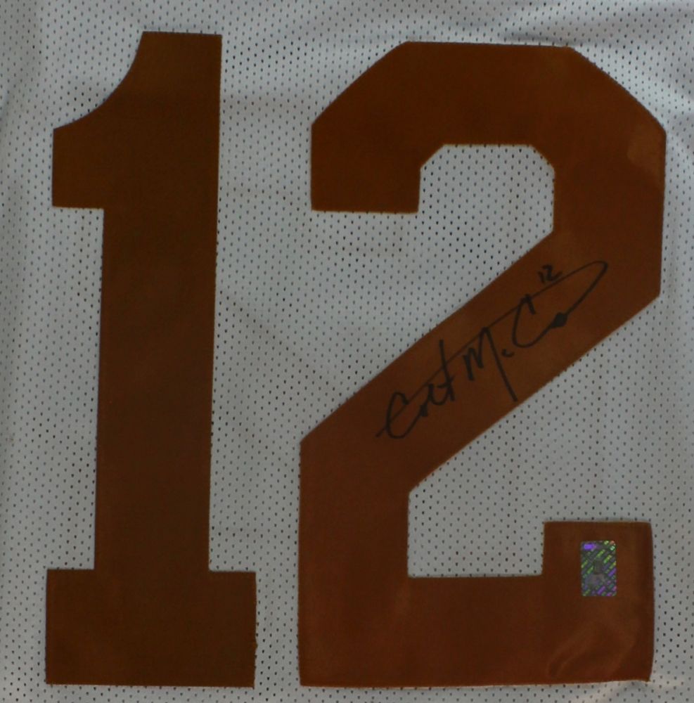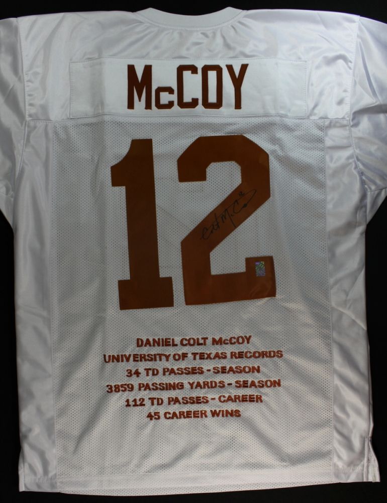 On-field style jersey. Everything is sewn on, size XL. Hand-signed and inscribed in black felt tip pen by Colt McCoy (Browns). McCoy's college career stats are custom stitched into the jersey below the reverse numbers. This item includes a Colt McCoy hologram.