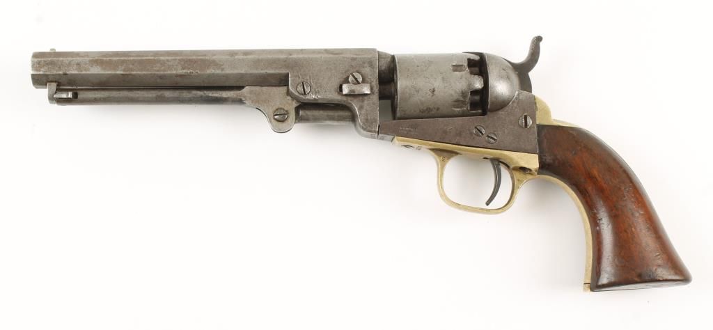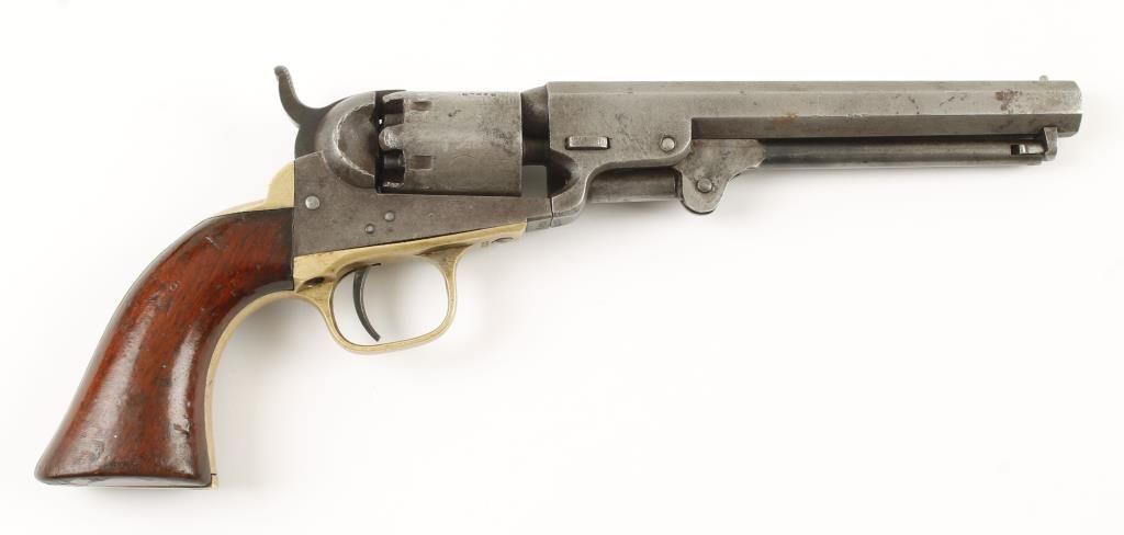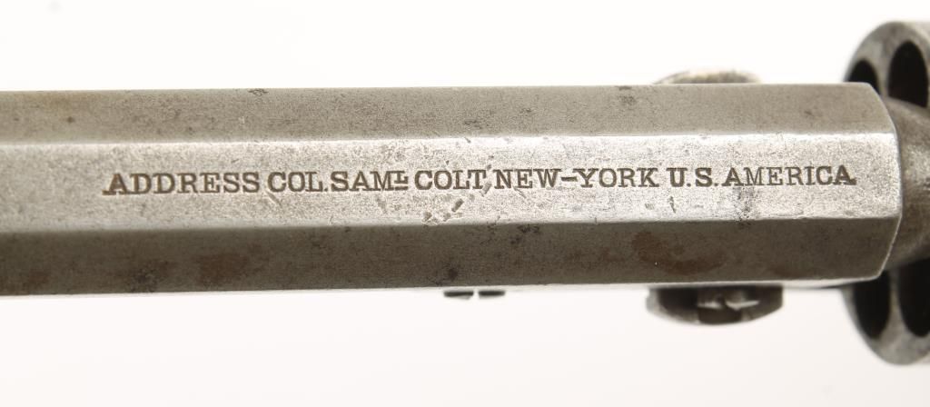 Early percussion 6 shot pocket revolver with 4" octagon barrel. Brass grip strap and trigger guard, smooth walnut grips, loading lever and stagecoach scene on unfluted cylinder. Barrel stamped "ADRESS SAML COLT NEW YORK U.S. AMERICA". All visible numbers matching. Action does not work. Condition: Fair showing traces of original finish. Grips are good as refinished.