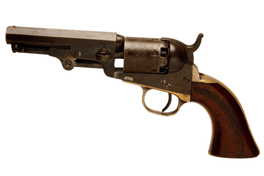 Colt Mdl 1849 Pocket Cal .31 SN:213993 Single action 6 shot pocket percussion revolver. Standard configuration, blued finish, brass grip frame with some of the silver still showing, wood grips, 4" barrel. Condition: Good to very good with the cylinder scene clearly visible. Left grip has an inscription scratched into it.