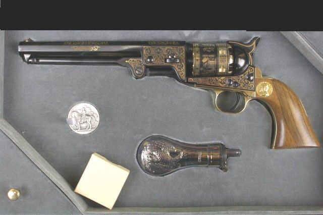 Colt Mdl 1851 Commemorative Cal .36 SN:480 Presentation wood cased with accessories Italian made copy of a Colt 1851 Navy percussion revolver, authorized by the US Historical Society entitled "The Official Robert E Lee Commemorative Pistol", 7 1/2" oPresentation wood cased with accessories Italian made copy of a Colt 1851 Navy percussion revolver, authorized by the US Historical Society entitled "The Official Robert E Lee Commemorative Pistol", 7 1/2" octagon barrel, blue finish with goldornamentation on the frame, cylinder and barrel assembly; brass trigger guard and back strap, wood grips with inset of Robert E Lee on the top of the left grip. This gun is in like new condition and is nicely ornamented with images of theConfederate White House, Lee's Mansion, Lee on his favorite horse, etc. The box is gray lined with two covered compartments, an inset powder flask and commemorative inset coin. The wood case is in excellent condition with inset panel on the lidshowing Lee on his horse with fancy bordering.