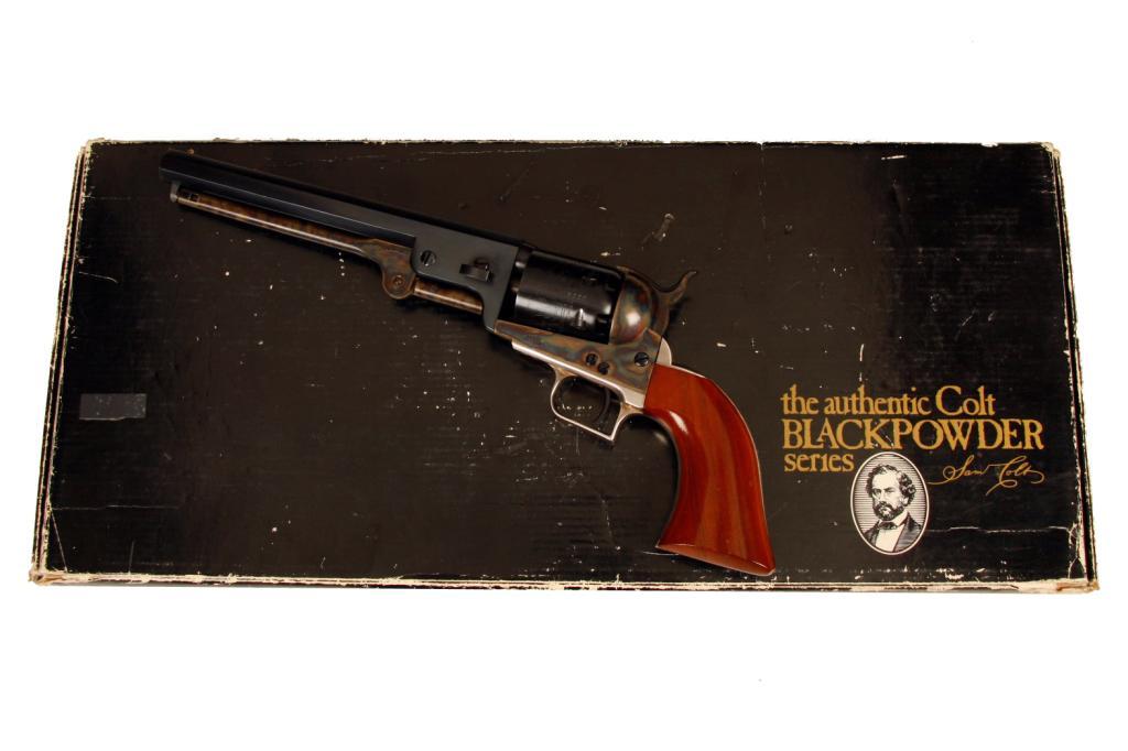 Colt Mdl 1851 Navy Replica Cal .36 SN:27336 Replica of Colt 1851 Navy Square back percussion revolver made by Colt. Blued barrel, case color frame, smooth wood grips, 7 3/4" barrel, good bore and action. Condition: Excellent in original box.
