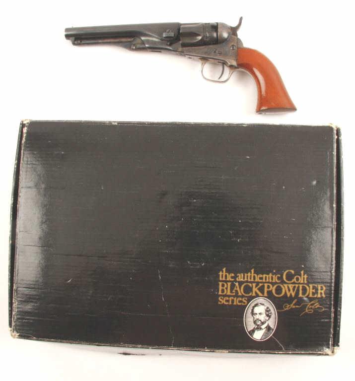 Condition: Looks unfiredModern copy of 1862 Colt percussion. Blued barrel and fluted cylinder, case color frame, nickel finished brass grip frame, smooth wood grips, 5 1/2" barrel, front sight bead, good bore and action.Condition: Looks unfired. In black powder box with instruction booklet.