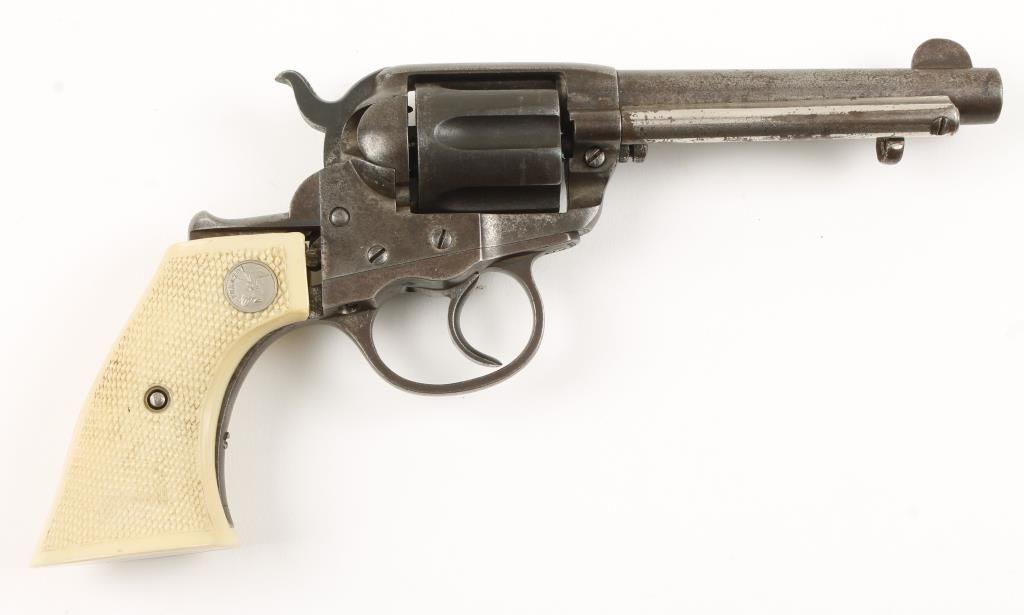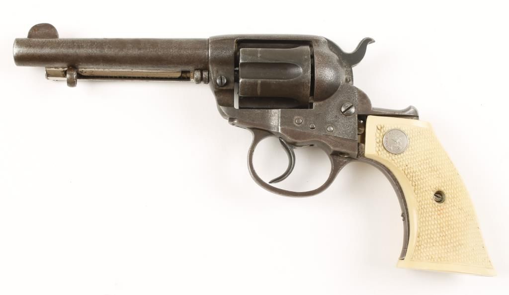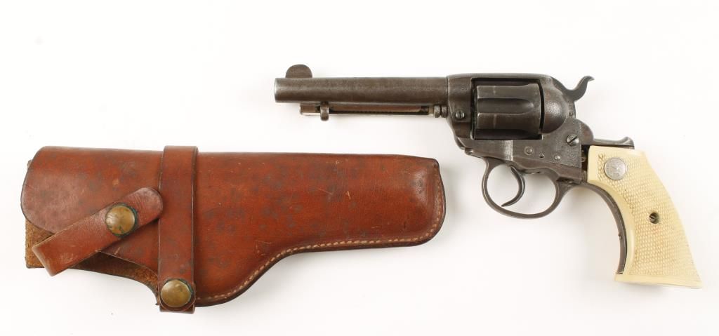 Double action 6 shot revolver made in 1902 with 4-1/2" barrel. Originally nickel finish, currently checkered white plastic grips which do not fit well. Ejector rod and fixed sites. Fair bore and poor action is not working properly includes hunter leather holster Condition: Overall poor to fair condition showing traces of original finish and light pitting throughout *CURIO & RELIC FIREARM*