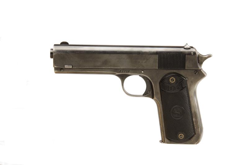 Colt Mdl 1903 .38 Rimless SN:31210 Early single action semi auto commercial pistol. Blued finish, black checkered grips, 4 1/2" barrel with fixed sights, good bore and action.