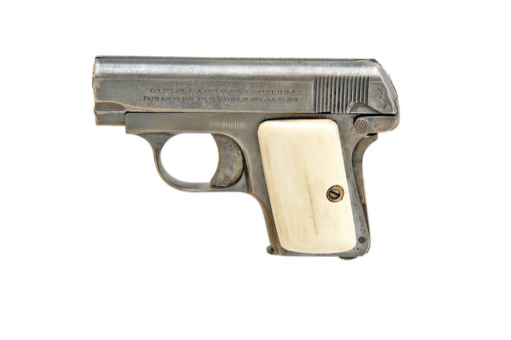 Colt Mdl 1908 "Baby" Cal .25acp SN:200115 Single action semi-auto pocket pistol made in USA with grip safety. Blued finish, ivory hand made grips, 2" barrel, fixed sights, good bore and action. Condition: Good to very good showing wear from age and uSingle action semi-auto pocket pistol made in USA with grip safety. Blued finish, ivory hand made grips, 2" barrel, fixed sights, good bore and action. Condition: Good to very good showing wear from age and use.