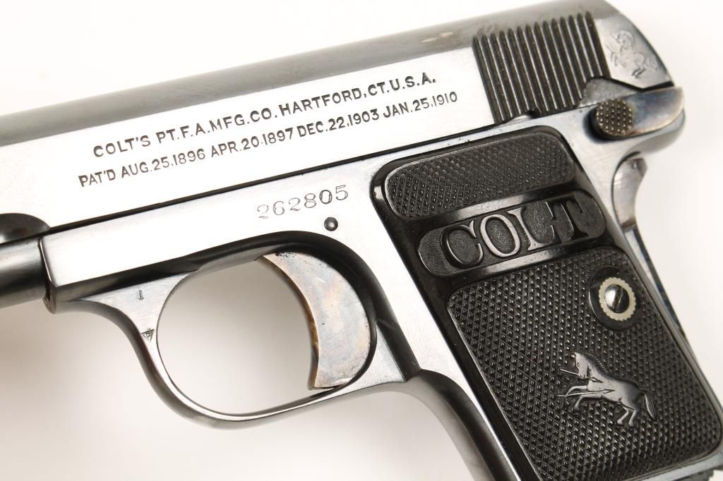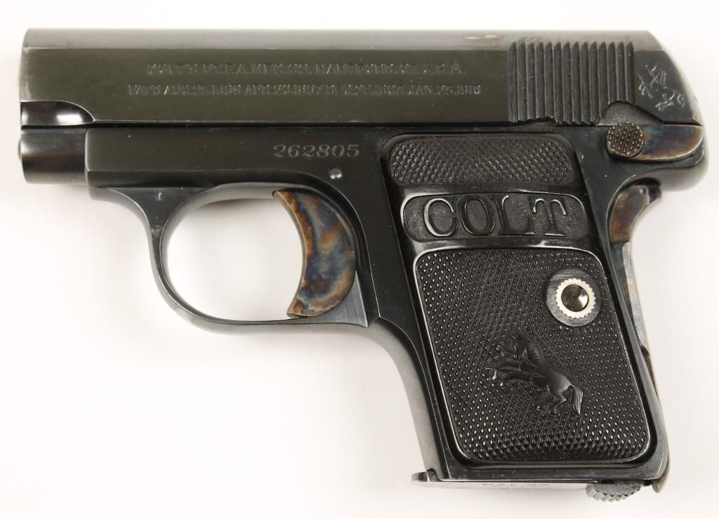 Small frame semi auto hammerless pocket pistol with 2" barrel. Blued finish, case colored hammer, slide lock safety and grip safety, checkered hard rubber grips and fixed sights. Excellent bore and action. Includes one 2-tone magazine. Condition: Very good to excellent showing small amount of high point wear. *Curio & Relic Firearm*
