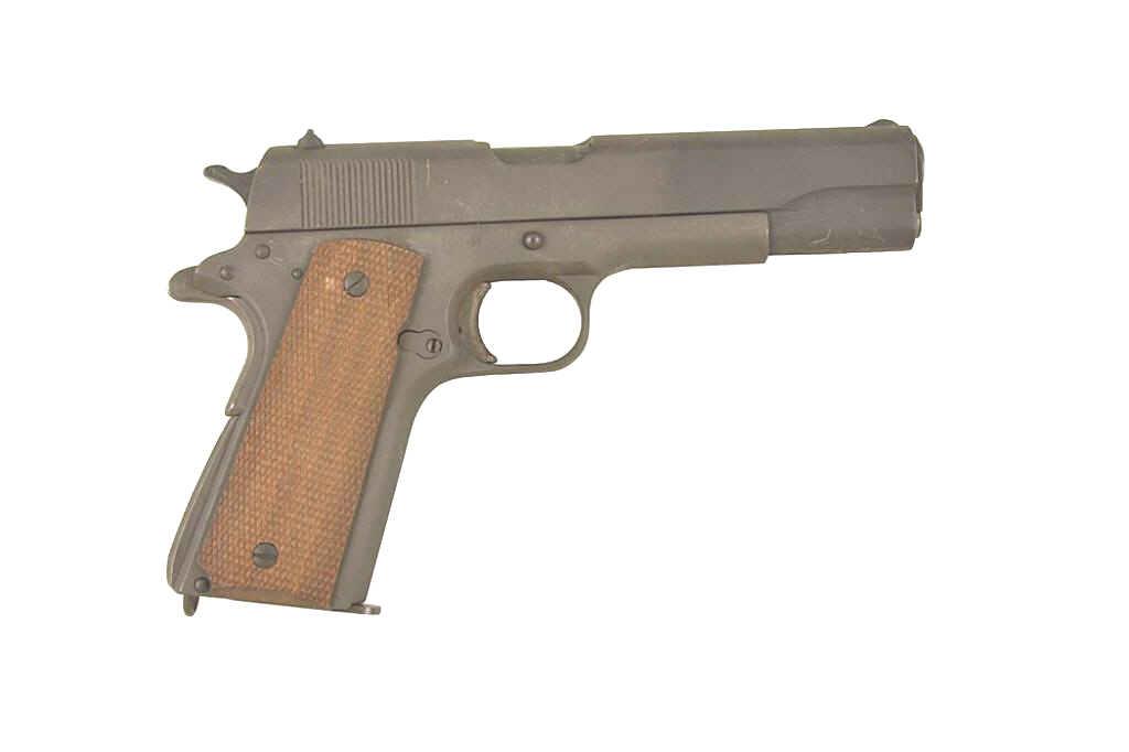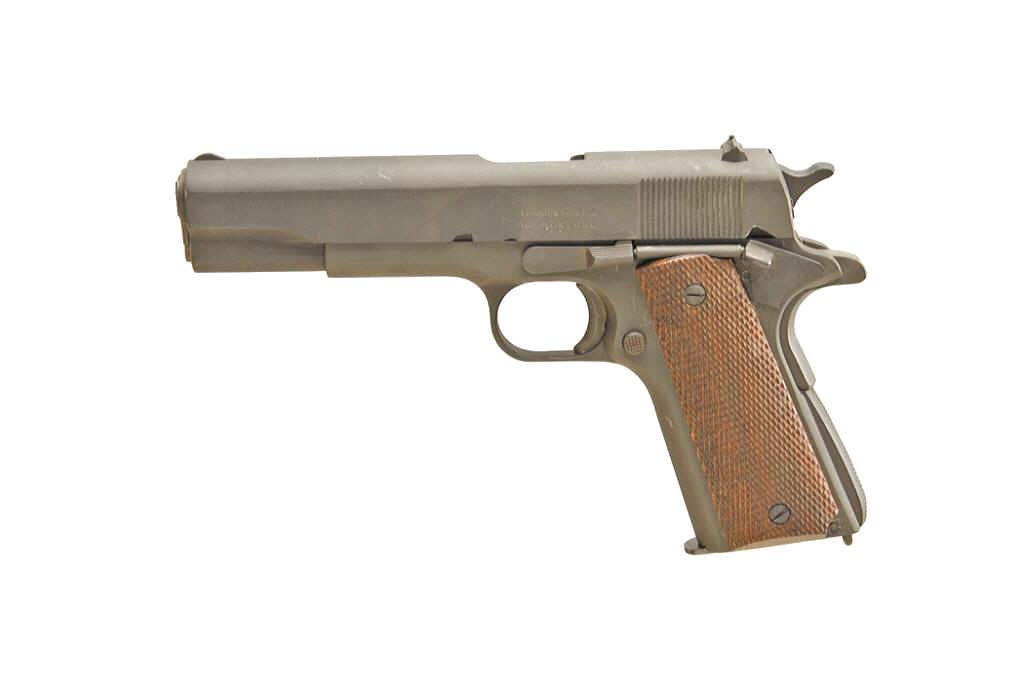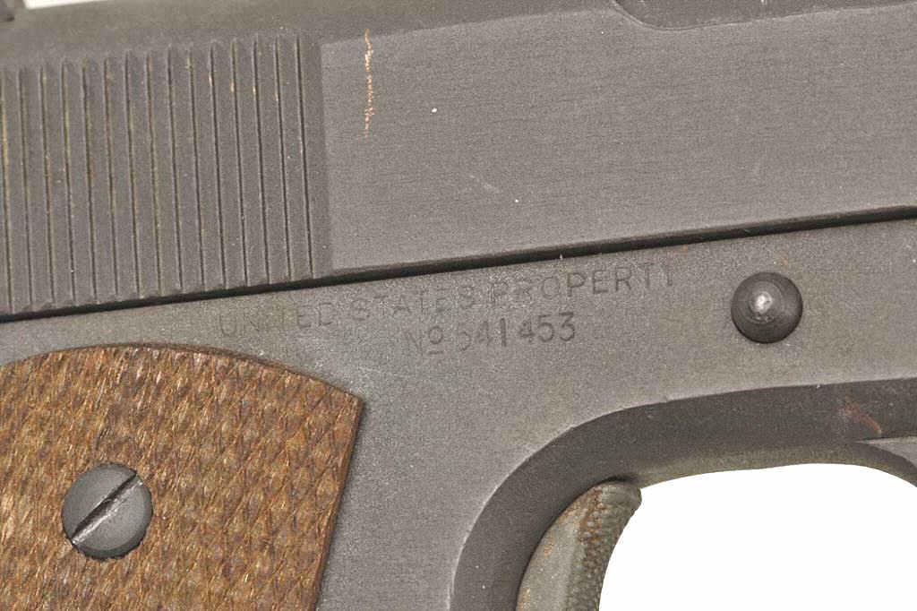 Colt Mdl 1911 Cal .45acp SN:541453 Arsenal refinished 1911 with Springfield frame and Remington Rand slide. Serial number is not 1911 but frame is marked "United States Property". Re-Parkerized post WW II finish, checkered wood grips, different serial nuArsenal refinished 1911 with Springfield frame and Remington Rand slide. Serial number is not 1911 but frame is marked "United States Property". Re-Parkerized post WW II finish, checkered wood grips, different serial number on standard 5"barrel, good bore and action. Condition: Very good to excellent as refinished. Includes 1 magazine.