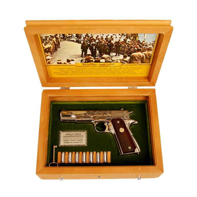 Colt Mdl 1911A-1 Cal .45acp SN:3690PTO "World War II Commemorative". Engraved nickel finish, wood gold medallion grips, fixed sight. Condition: Excellent in blond wood lined case with picture of treaty signing on Sept 2, 1945 and list of Asian-Pacific theatre battles. Case is missing its glass.