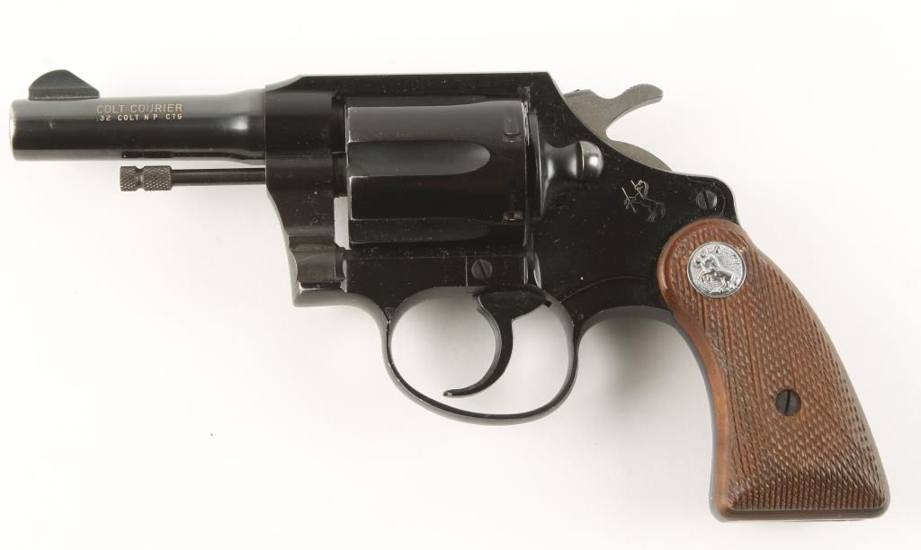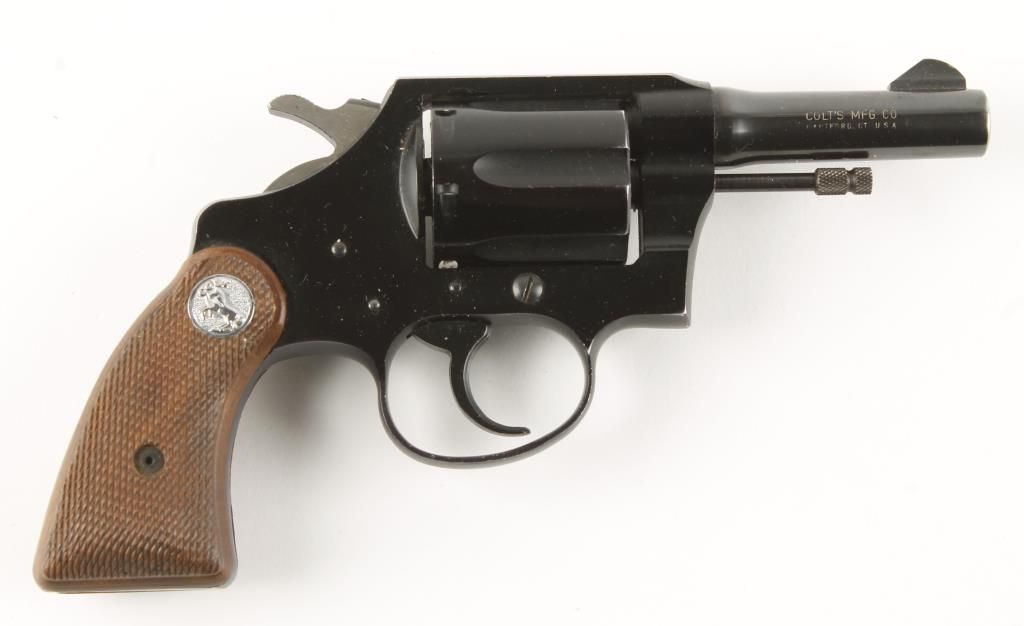 Double action 6 shot revolver with 3" barrel. Blued finish, aluminum alloy frame and cylinder, checkered wood grips with medallions and fixed sights. Made only in 1955 and 1956. Very good bore and action. Condition: Very good showing high point and muzzle wear. *Curio & Relic Firearm*