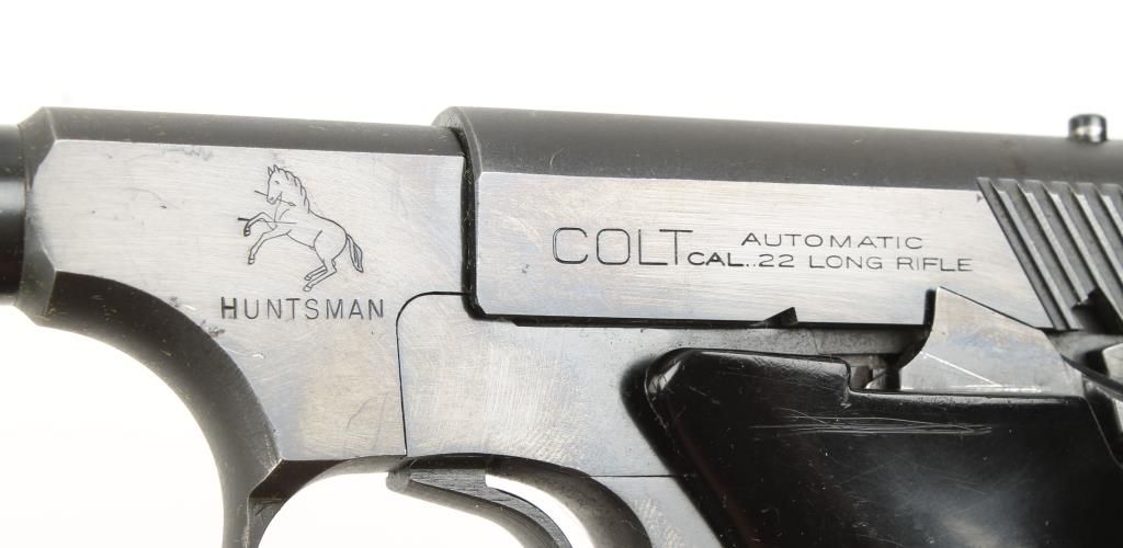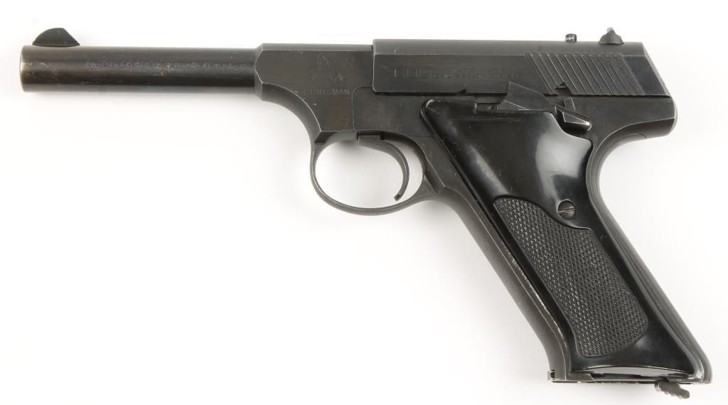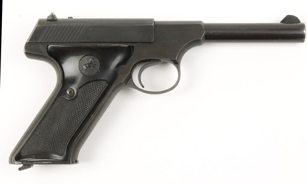 Single action semi auto rimfire pistol made in 1955, the first year of this model. Blued finish, checkered black plastic grips, 4-1/2" barrel and dovetail rear sight. Very good bore and action. Includes 1 magazine. Condition: Very good showing light muzzle wear and a few small scratches from use.