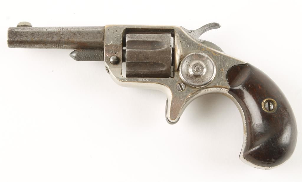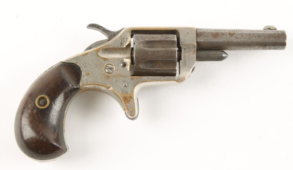 Early spur trigger 7 shot rimfire revolver made about 1876, with 2-1/4" round barrel with flat sides. Nickel finish over brass frame, rosewood birds head grips, long fluted cylinder, and fixed sights. Dark bore and very good working action. Condition: Good to very good overall showing 50% original finish, and grips are very good. *Antique Firearm*