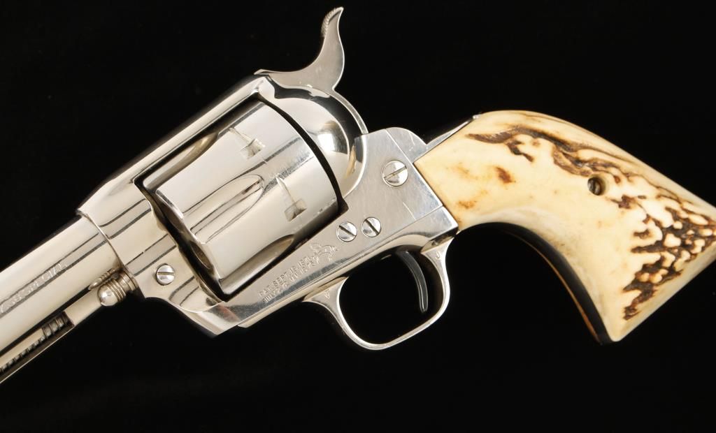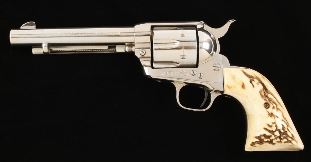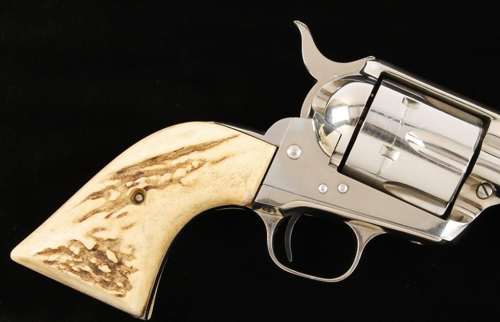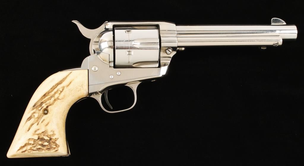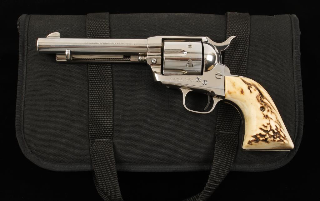 Early second Gen single action revolver made in 1956 with 5-1/2" barrel. Nickel finish, oversized stag grips and fixed sights. Very good bore and nice crisp action. Includes soft sided case. Condition: Very good showing typical light scratching in nickel. *Curio & Relic Firearm*