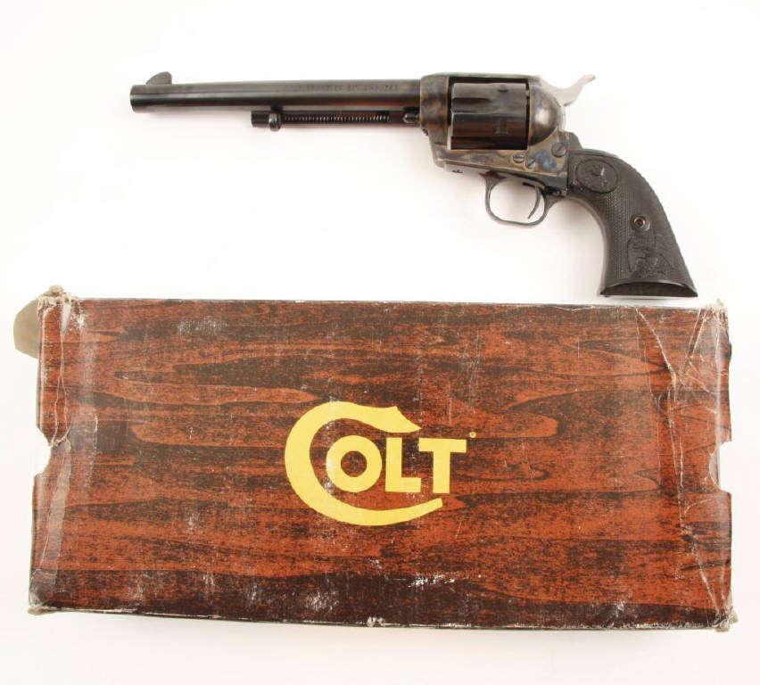 Condition: Near new and may be unfired. In wood grain box with foam insert, both of which have some damage.Very nice near new SAA "Frontier Six Shooter". Standard configuration with 7 1/2" barrel. Condition: Near new and may be unfired. In wood grain box with foam insert, both of which have some damage.
