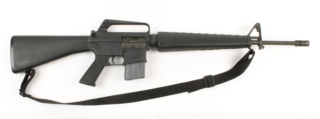 Early semi auto AR-15 rifle with 20" barrel. Parkerized finish, black plastic stock, pistol grip and handguard, bayonet lug and sling. Very goo bore and action. Includes 1 magazine. Condition: Very good showing light use.