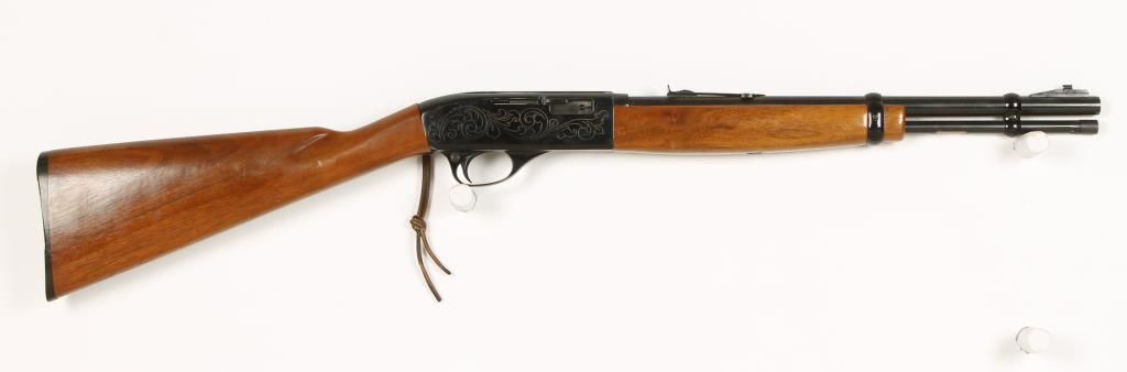 Semi auto rimfire saddle ring carbine with 16" barrel. Blued finish, straight grip wood stock and forearm, full length tube magazine, stagecoach scene on left side of receiver and scroll engraved on right side and open sights. Good bore and action. Condition: Fair to good showing light pitting throughout and wood is good. Modern Firearm*