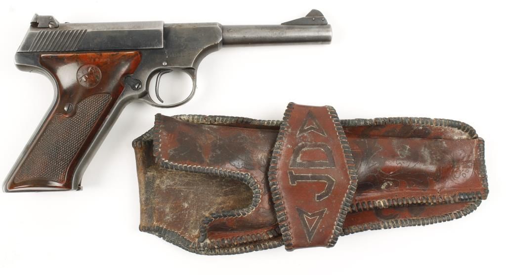 Single action semi auto sport rimfire pistol made in 1949 with 4-1/2" barrel. Blued finish, checkered wood grain plastic grips and adjustable rear sight. Good bore and action. Includes leather holster marked "JD" and 1 magazine. Condition: Fair to good showing 40% bluing remaining.
