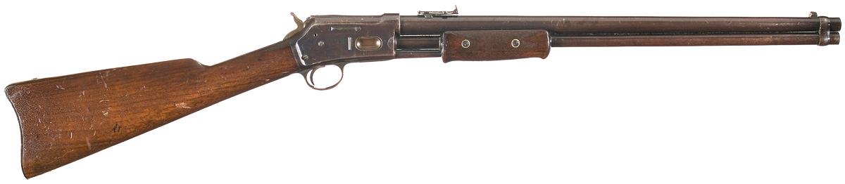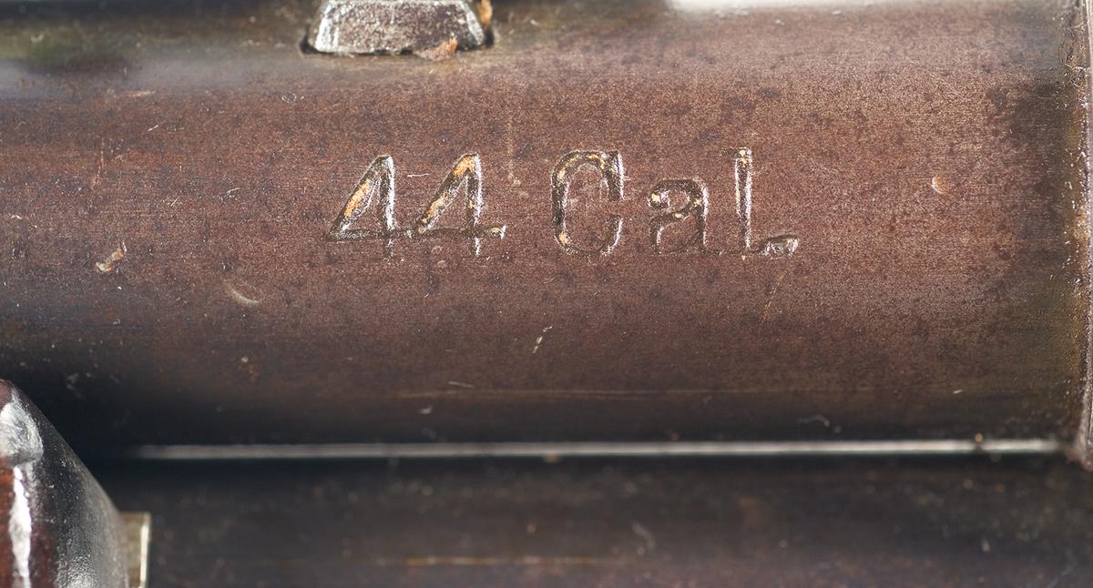 Manufactured in 1894. Blade front and folding ladder rear sights. Saddle ring mounted on the left side of the receiver which is marked with the Rampant Colt. The top of the barrel has the two line Hartford address/patent dates marking and the left rear is marked "44 Cal." The serial number is marked on the lower tang. The upper tang has been drilled for a tang sight mount. Smooth straight grip stock and checkered forearm.