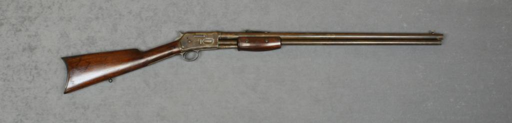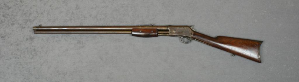 Colt Medium frame Lightning Model pump rifle, .44-40 cal., 26” round barrel, blue finish, wood stocks, #78431; British proofed and right side of frame engraved “S. Chambers, Gunmaker, Cardiff & Bristol” . This gun is in overall very good condition showing traces of blue in protected areas with balance gone to brown; good action, bore and markings, stocks are overall very good with scattered old mars and scratches from carry andstorage, also a square marking on the right side of the butt stock in what appears to be old ink that shows lettering that may be further discernable under heavy magnification. An interesting Lightningrifle. Est.: $800-$1,600.