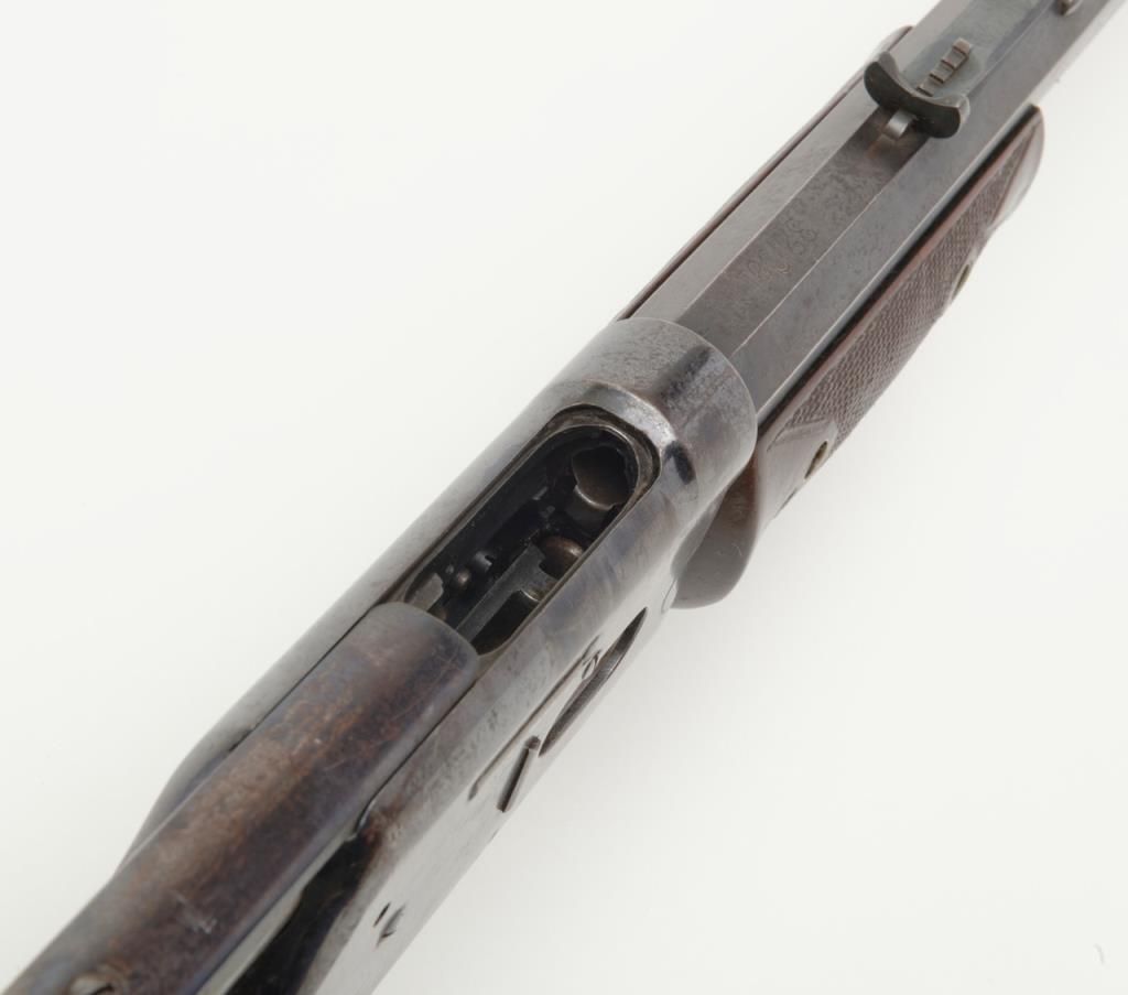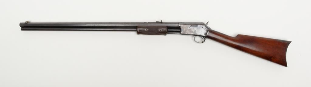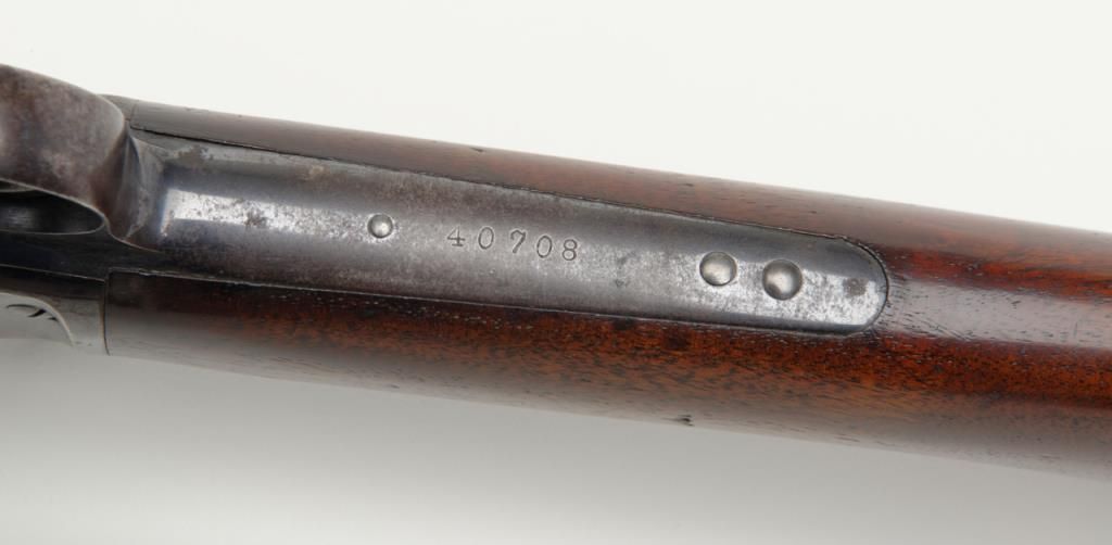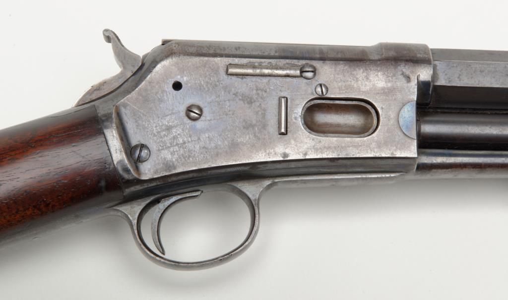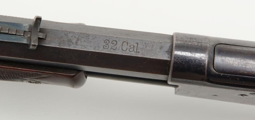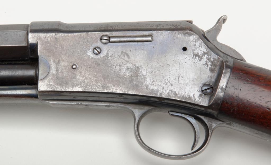 Colt Medium frame Lightning pump action rifle, .32 cal., 26” octagon barrel, blue finish, checkered wood forend, wood butt stock, #40708 in overall very good condition showing considerable original blue finish on the barrel and loading tube;approx. 40% original blue on the receiver, crisp action, sharp markings and fair to good bore; very good wood stocks with several scattered old mars to the butt stock from carry and storage. (Antique). Est.: $1,100-$2,200.