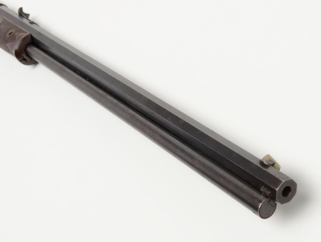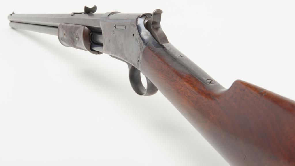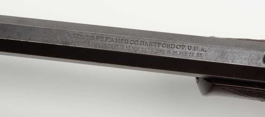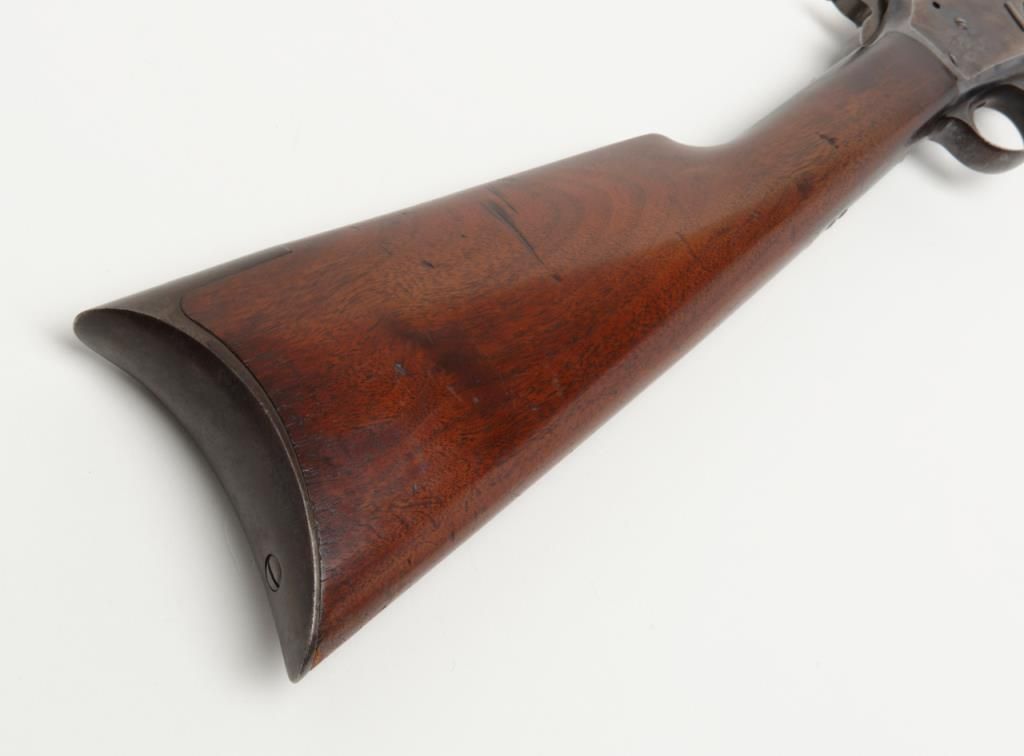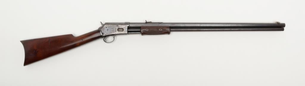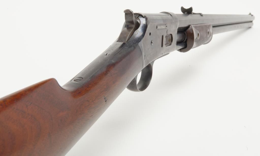 Colt Medium frame Lightning pump action rifle, .32 cal., 26” octagon barrel, blue finish, checkered wood forend, wood butt stock, #40708 in overall very good condition showing considerable original blue finish on the barrel and loading tube;approx. 40% original blue on the receiver, crisp action, sharp markings and fair to good bore; very good wood stocks with several scattered old mars to the butt stock from carry and storage. (Antique). Est.: $1,100-$2,200.