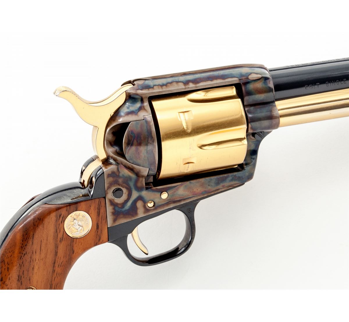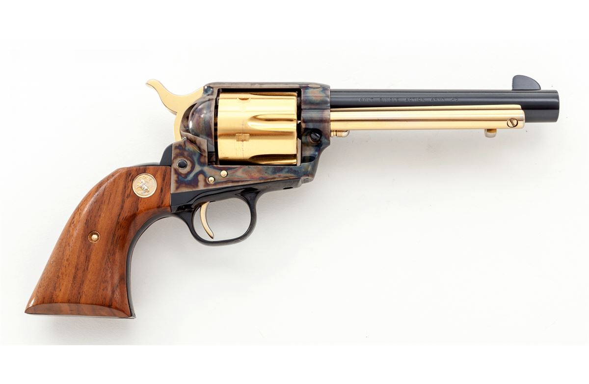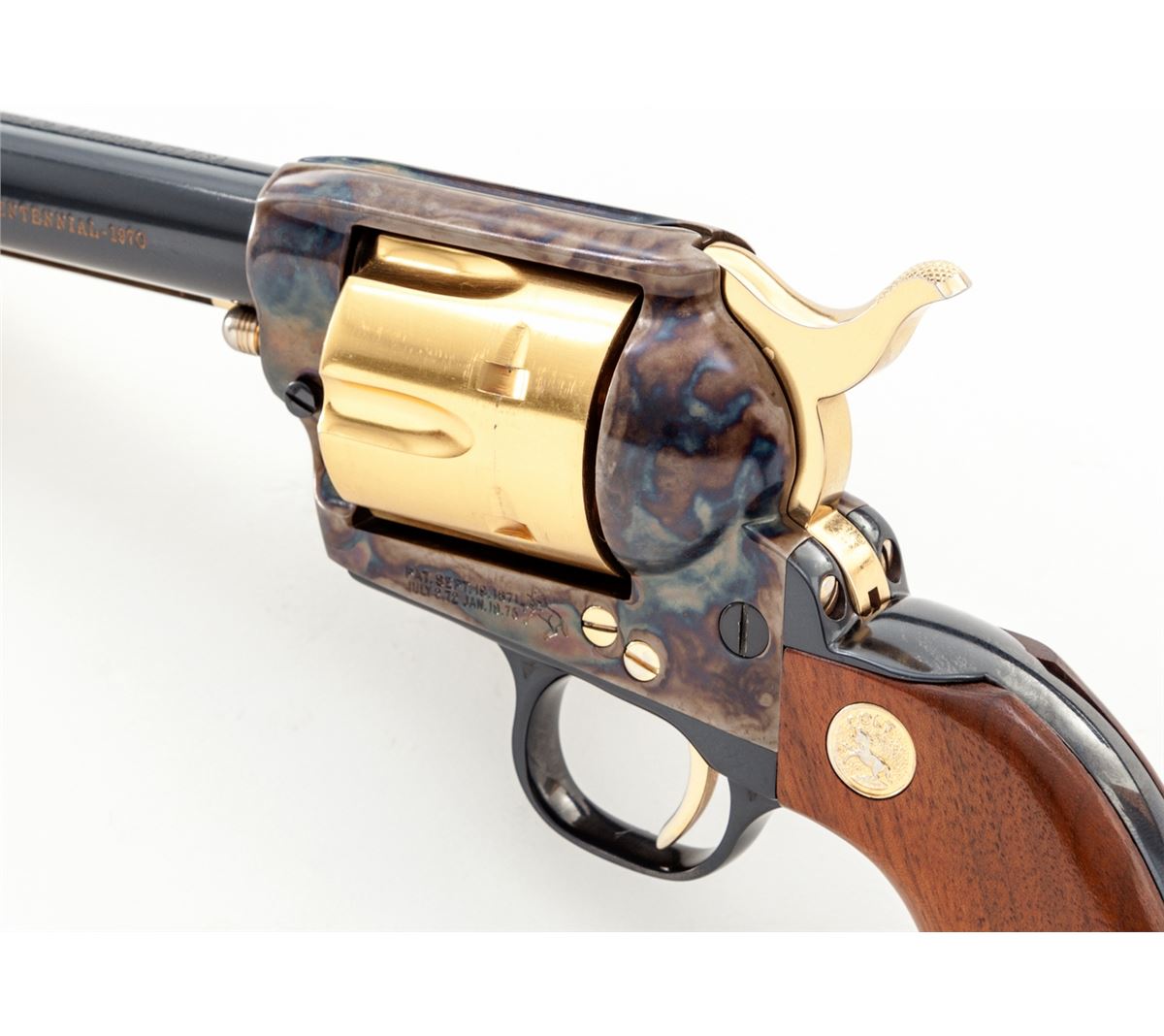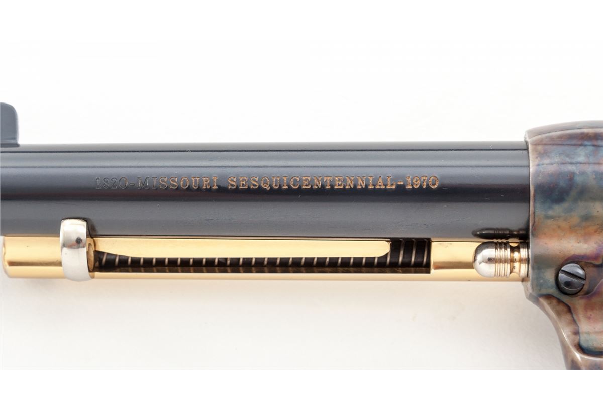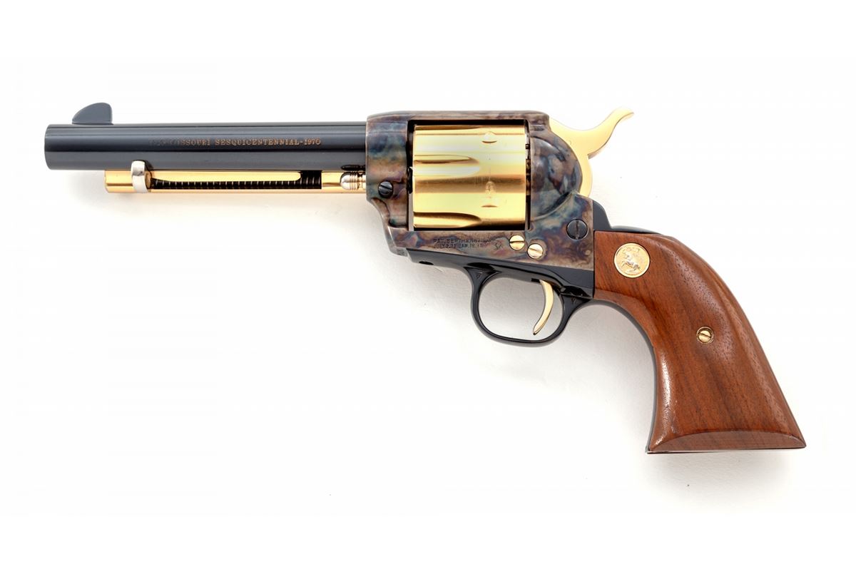 Colt Missouri SesquiCentennial Single Action Revolver (1820-1970), #P843MOS, .45 Colt cal., 5-1/2'' barrel, blue and case hardened finish, gold cylinder, hammer, trigger, axle and ejector rod housing; with two-piece walnut grips with Colt medallions. Condition is near excellent retaining approx. 98%+ royal blue to barrel. Gold cylinder with light scratches and small index mark. Crisp action, bright bore. No box. Est.: $750-$1,000. (C&R)