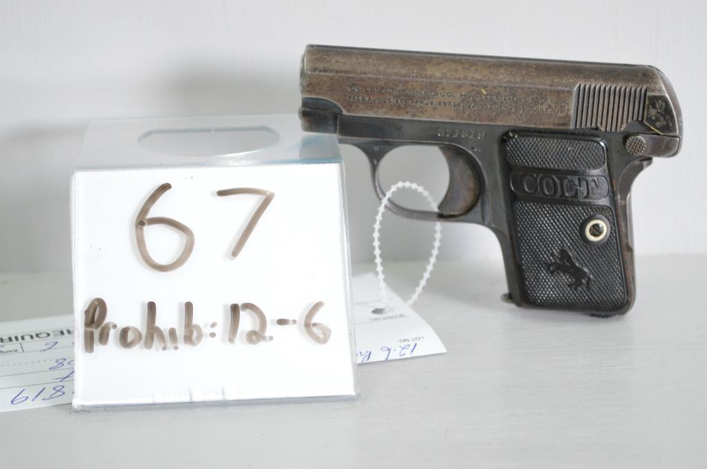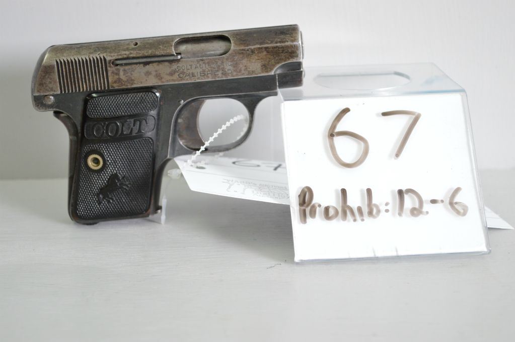 Colt Mod 1908 .25 ACP cal 6 shot Semi Auto Pistol w/ 52 mm bbl [ fading blue , good Colt checkered grips, some light surface rust in some areas, mag engraved R.C. T. , Circa 1926 ] Ser # 371819 Prohib 12-6 Cert # 17825138