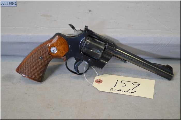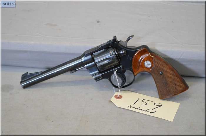 Colt Mod Officer's Model Match .22 LR cal 6 shot Revolver w/ 152 mm bbl [ blued finish, some holster wear to barrel muzzle & cylinder w/slight ring, adjustable rear sight, trigger shoe, checkered Colt Insignia grips w/right side chipped by trigger guard & missing that part of grip ] Ser # 84638 Restricted Handgun Cert # 5696977