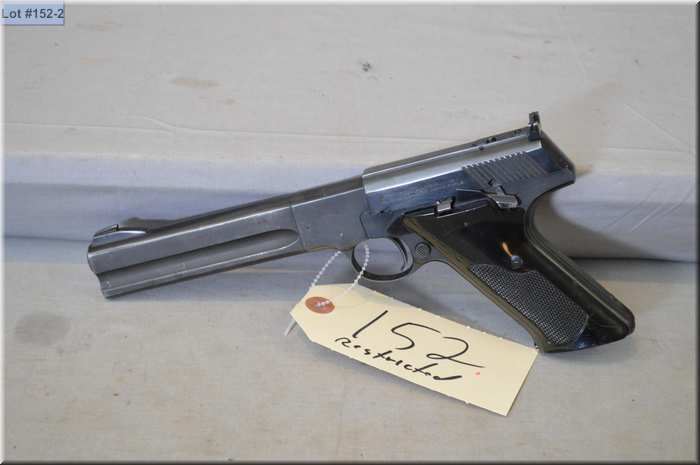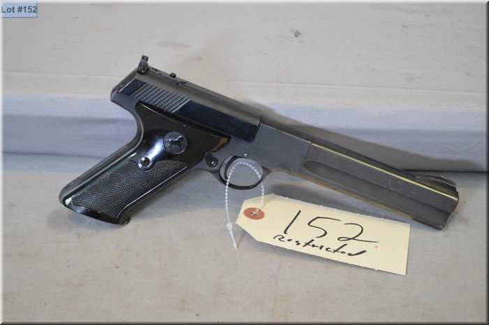 Colt Mod Woodsman Match Target .22 LR cal 10 shot semi automatic Pistol w/152 mm bbl [ blued finish starting to fade w/few marks, adjustable rear sight, checkered Colt grips, also few marks ] Ser # 142700S Restricted Handgun Cert # ?