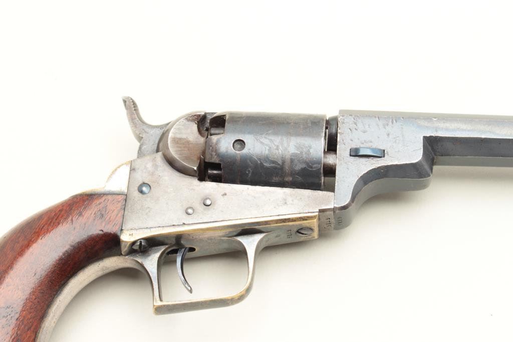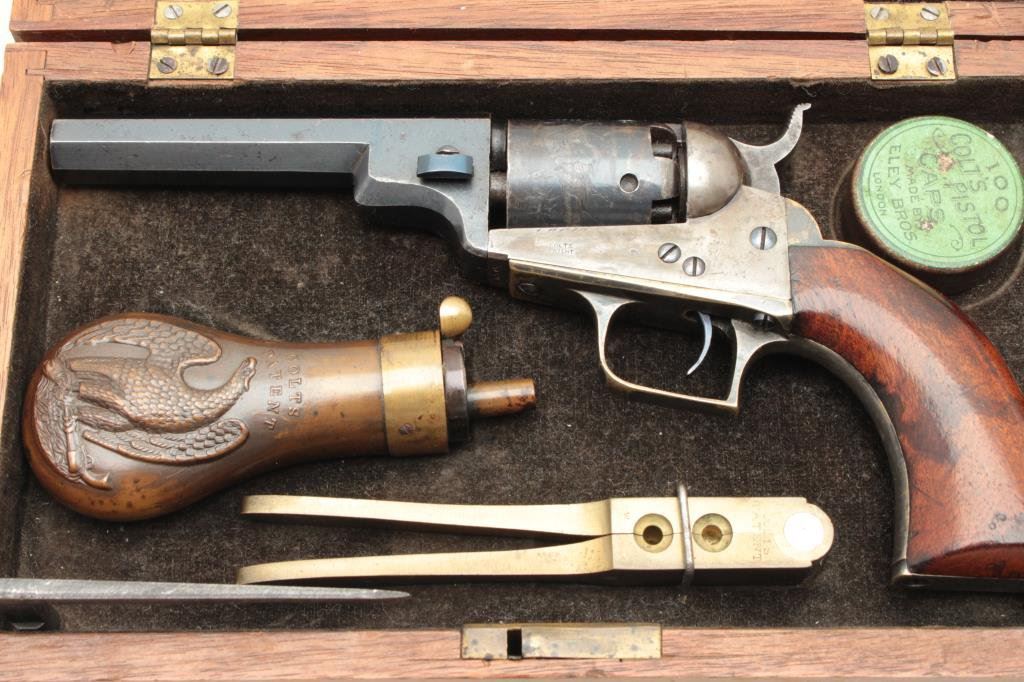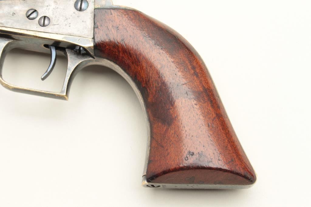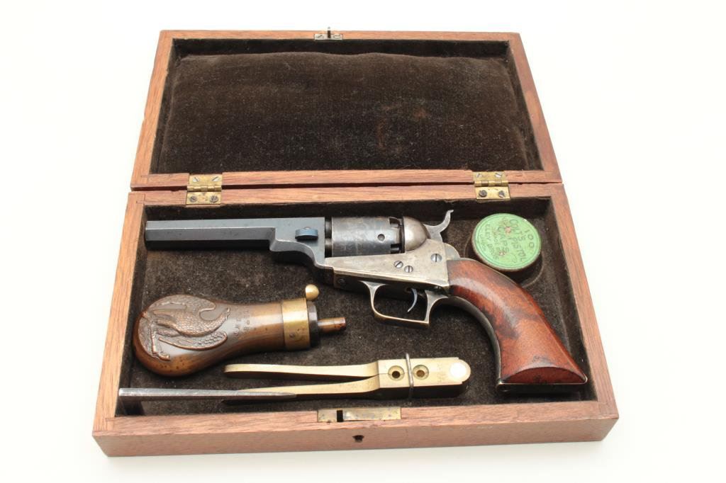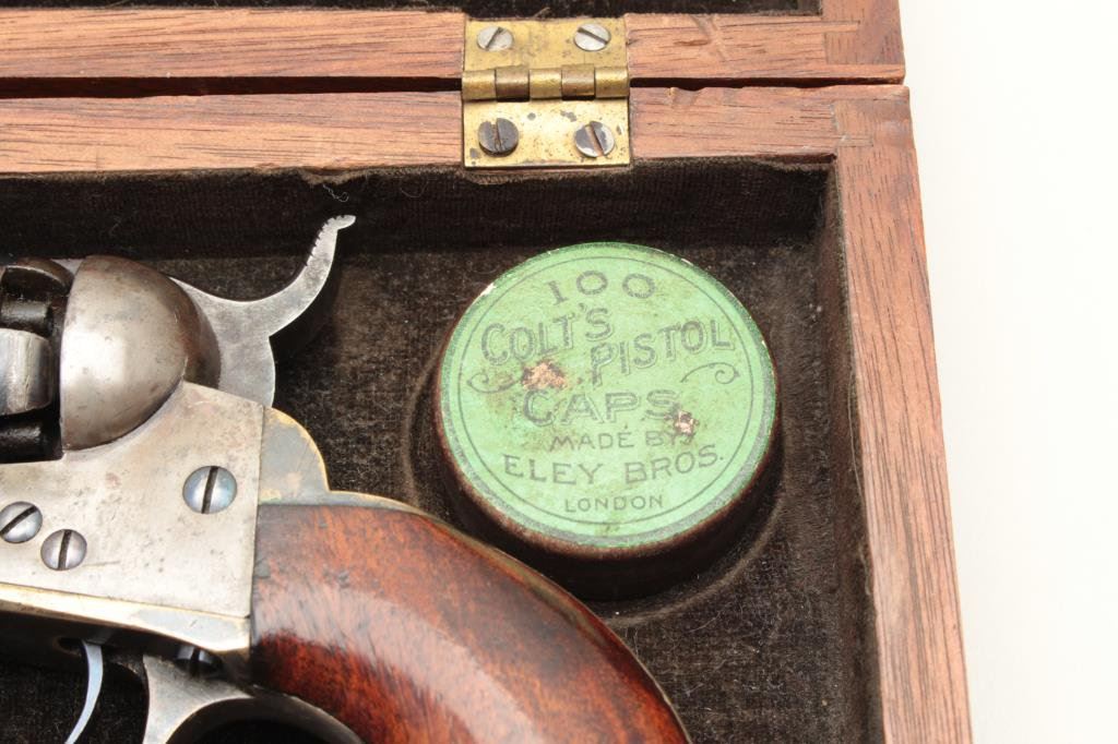 desirable and early beveled lid Paterson style original casing with accessories, S/N 6315. 80-90% original blue with minor aging, slight losses at the edges, and minor scratches. 95% plus near perfect original Indian fight cylinder scene. The frame and hammer show 50%-60% original silver gray light case hardening as proper in this period. The straps show 0.8 plus darkened and uncleaned original silver plate. The grips show some minor staining and aging but at least 0.8 varnish and very good plus also. All matching serial numbers with super markings. The 1 original cylinder pin is retained. Excellent and bright bore. The casing is 1 original with near fine lining showing slight fading and normal aging at contact points. The flask shows 70%-80% finish and the brass mold is near fine. The case shows a few marks and scratches on the exterior but a nice original light color with 0.9 plus original varnish and just showing one minor stress crack and a few scratches. The case matches the appearance of his fine