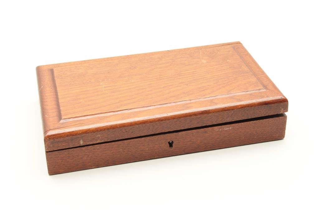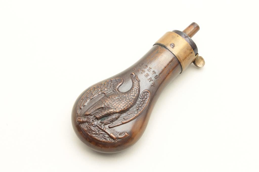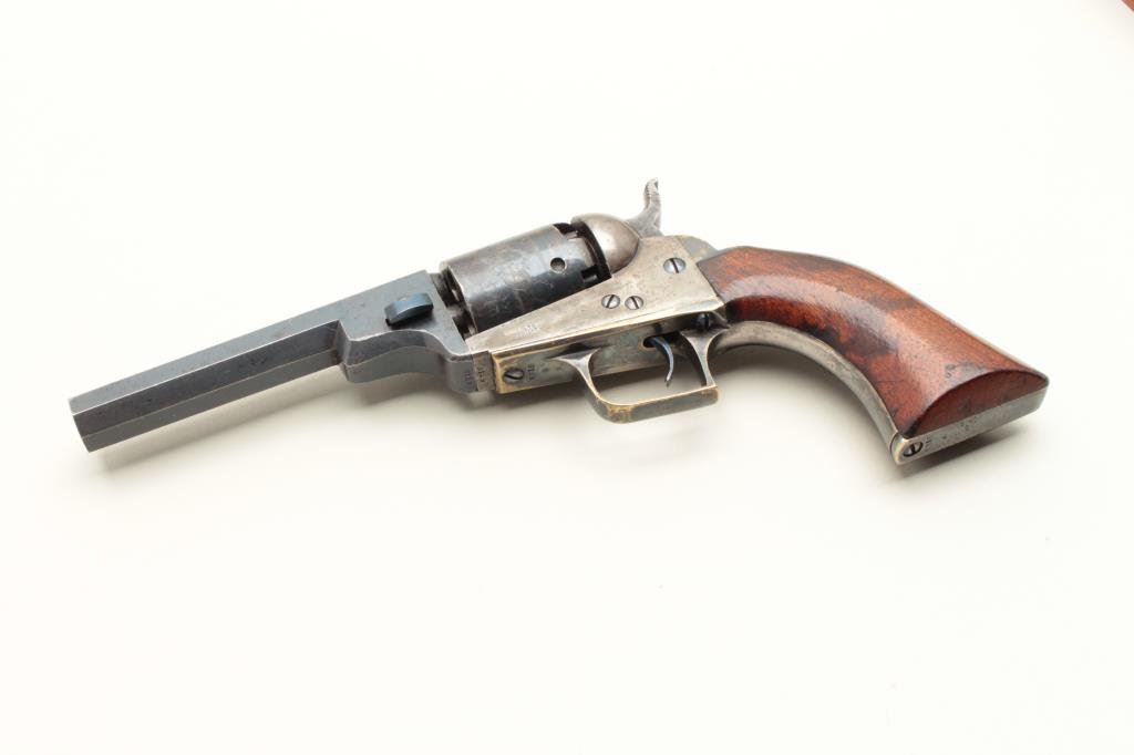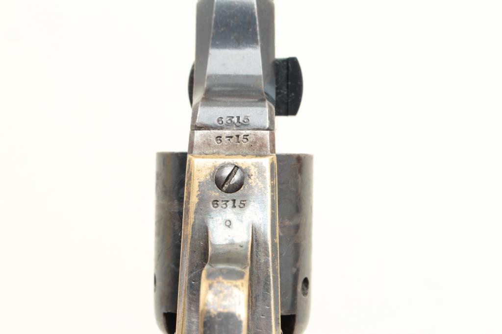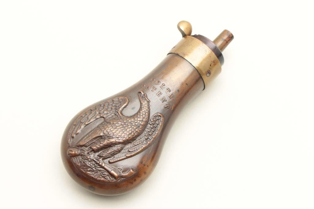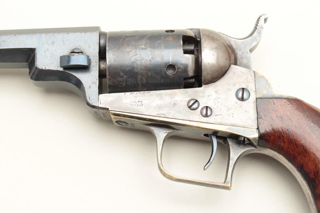desirable and early beveled lid Paterson style original casing with accessories, S/N 6315. 80-90% original blue with minor aging, slight losses at the edges, and minor scratches. 95% plus near perfect original Indian fight cylinder scene. The frame and hammer show 50%-60% original silver gray light case hardening as proper in this period. The straps show 0.8 plus darkened and uncleaned original silver plate. The grips show some minor staining and aging but at least 0.8 varnish and very good plus also. All matching serial numbers with super markings. The 1 original cylinder pin is retained. Excellent and bright bore. The casing is 1 original with near fine lining showing slight fading and normal aging at contact points. The flask shows 70%-80% finish and the brass mold is near fine. The case shows a few marks and scratches on the exterior but a nice original light color with 0.9 plus original varnish and just showing one minor stress crack and a few scratches. The case matches the appearance of his fine