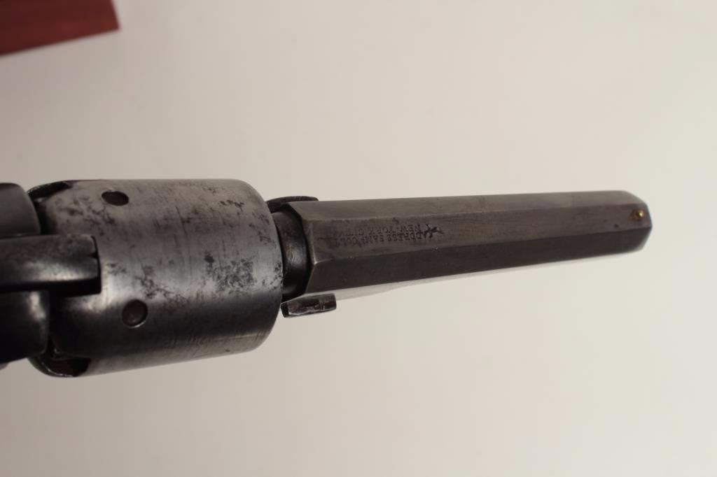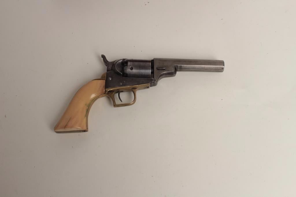 caliber, 4” octagon barrel, grey patina to metal surfaces, brass straps and ivory grips, S/N 1978 (matching on frame, barrel, trigger guard and backstrap; no number visible on cylinder); in overall very good condition with very good action and markings and beautiful grips; cylinder scene is not visible; accompanied by a custom made later presentation wood box that is compartmentalized for the revolver and contains a section for lead balls, a cap tin, a brass Colt’s Patent bullet mold, a metal flask, a combination screwdriver/nipple wrench and a key that operates the case’s lock. (Antique). Est.: $3,000-$3,500.