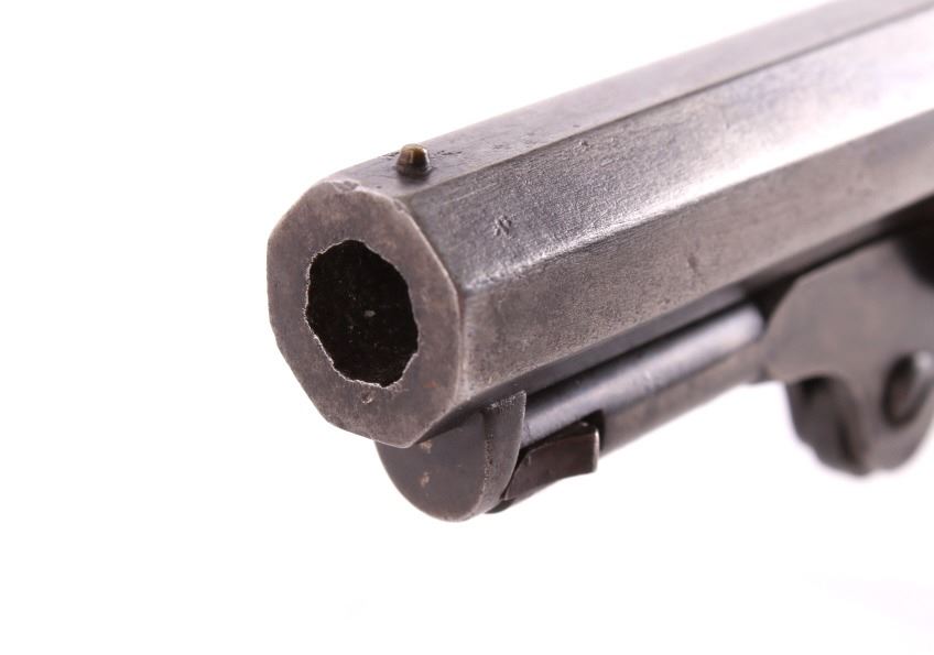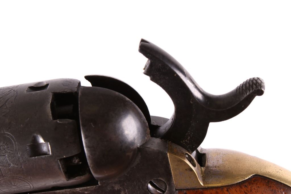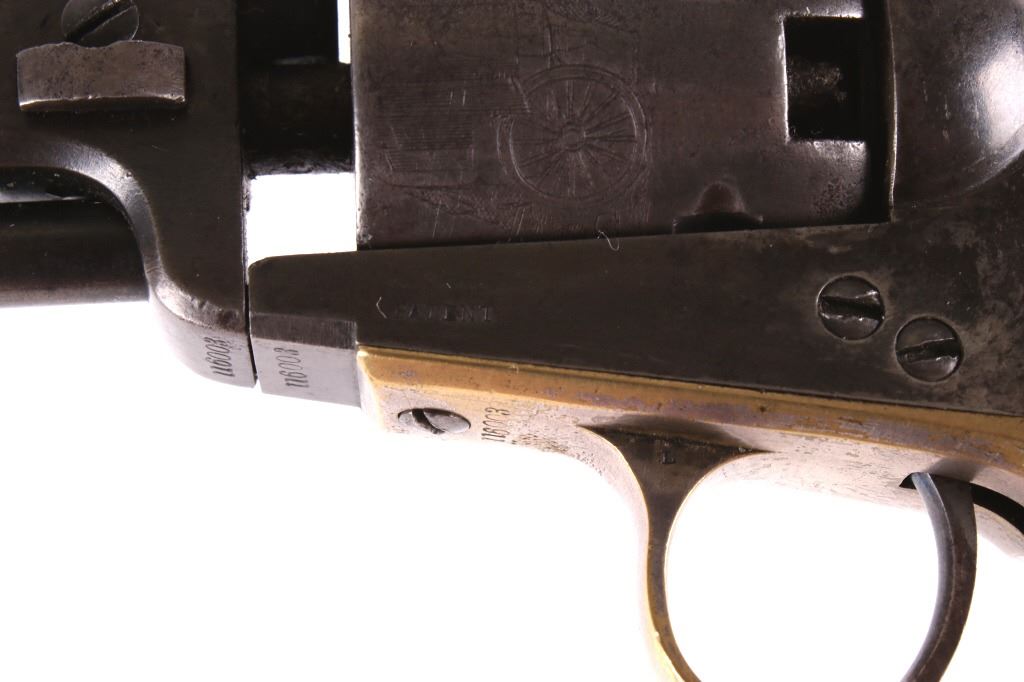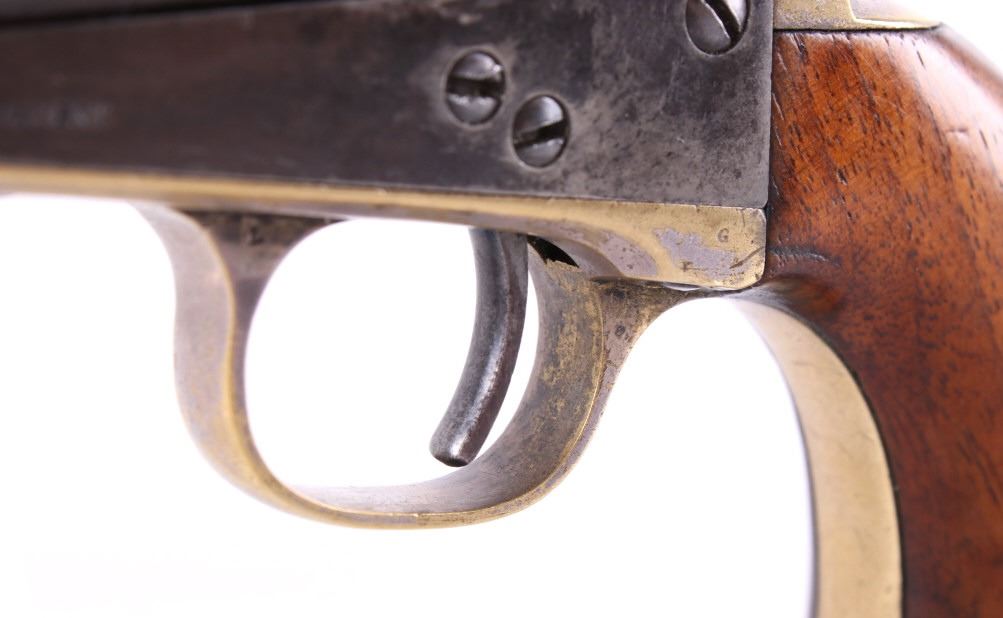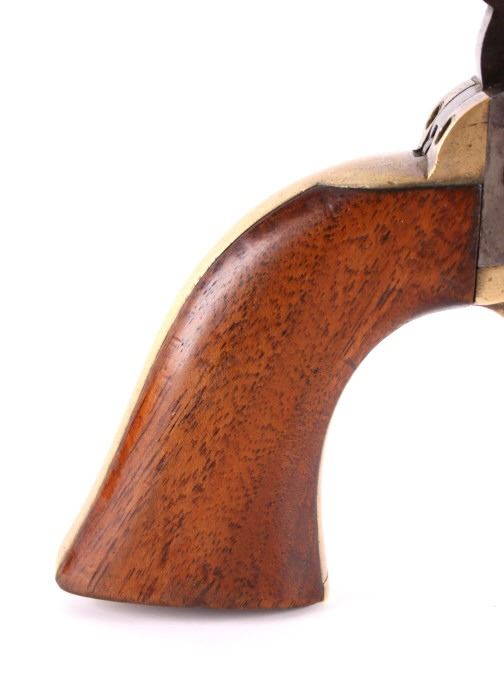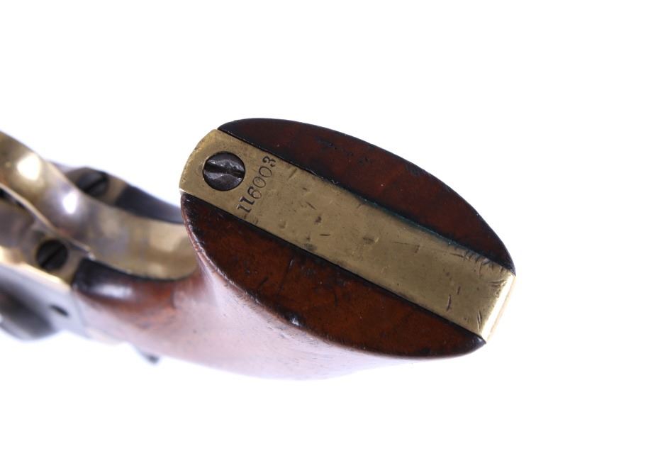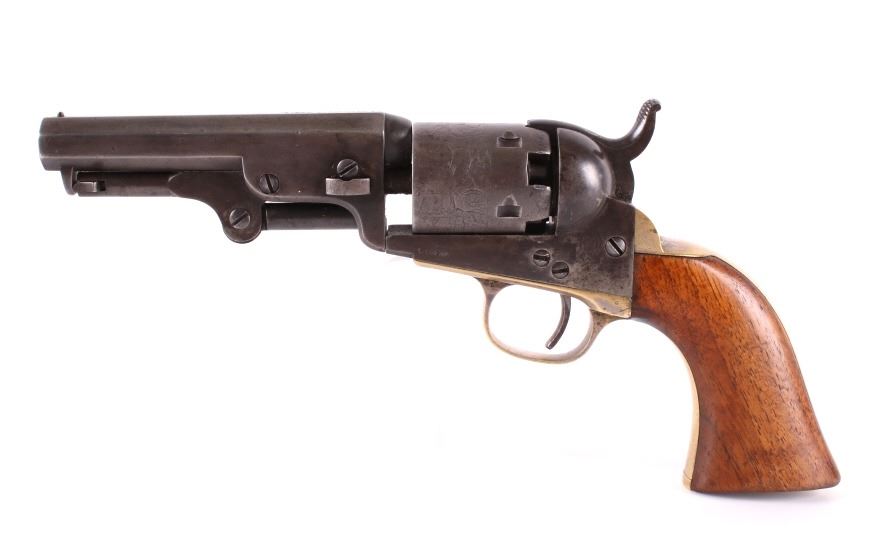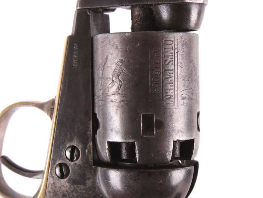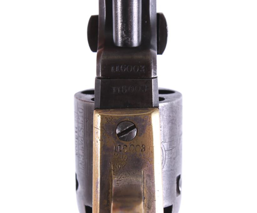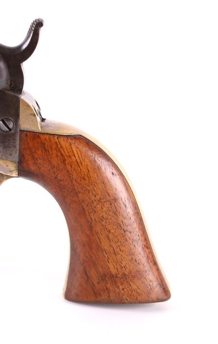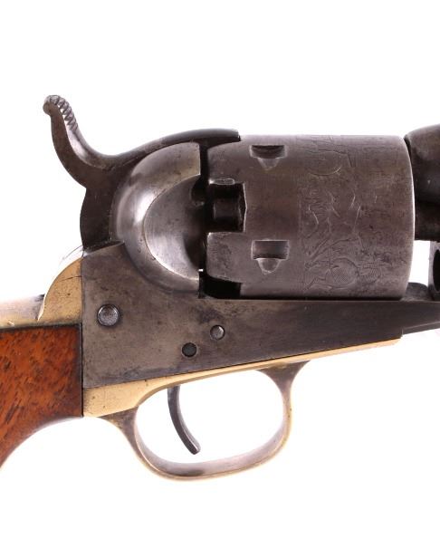 Extremely fine condition and early Colt Model 1849 Pocket Revolver with 4” octagon barrel, serial number 116003 indicating a Pre-Civil War manufacture date of 1856. A superb original example .31 caliber, 5-shot revolver that found favor with lawmen and outlaws alike who carried a small back-up revolver. It also found immediate acceptance by ladies of the evening, gamblers, well-heeled gentlemen, Civil War officers and enlisted men as personal weapons. Many of these also saw service in the gold fields of California. The Model 1849 was one of Colt’s most popular designs that was large enough for aimed fire, yet small enough to conceal in a waistband or unobtrusive holster. Matching serial numbers on the frame, trigger guard, barrel, wedge, rammer and cylinder. The barrel is correctly marked in the early two line style “ADDRESS COL. SAM COLT over NEW-YORK CITY.” along with “COLT’S PATENT” on the left side of the frame. Nice overall aged blue on the barrel and cylinder with exceptional walnut grips, brass back strap and trigger guard. The upper back strap, and trigger guard still retain some original silver plating that is almost never present on this model. The frame is an attractive, uncleaned aged patina. The cylinder retains ABOUT ALL OF THE SHARP ORIGINAL ROLL ENGRAVED STAGE COACH HOLD-UP SCENE! This is usually worn away on most specimens, especially early examples. The cylinder is also clearly stamped “COLTS PATENT” with matching serial number. Excellent mechanically, this fine Colt shows no signs of ever having been rusted, pitted or even cleaned and displays a very tight and crisp action. It is an exceptional example of one of the most popular and successful of the Colt percussion revolvers and a key model for any Colt, Civil War or Old West collection. Rarely do such early examples come up for sale in this high state of preservation with no signs of cleaning. This firearm qualifies as an Antique, and does not require FFL Transfer or NICS Background Check. Matt