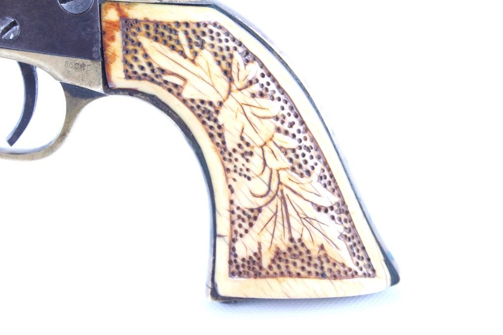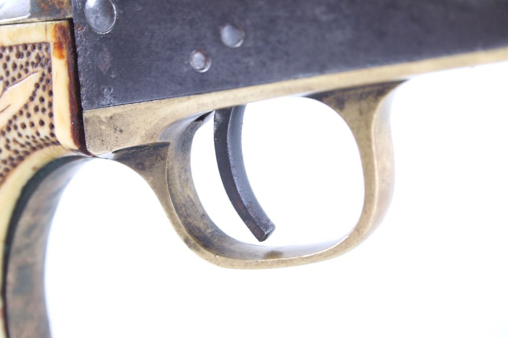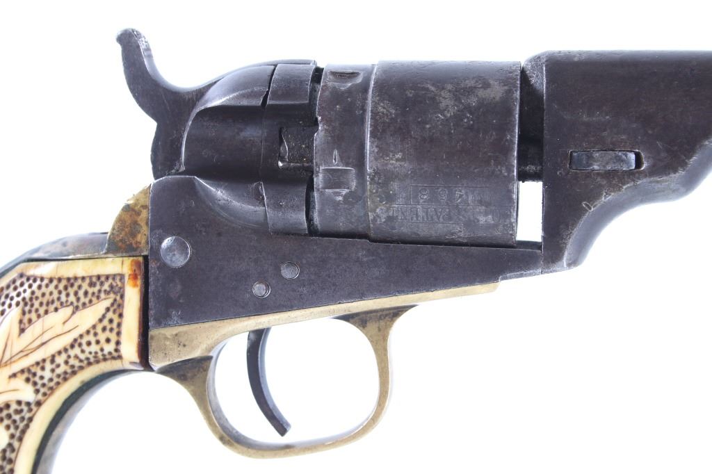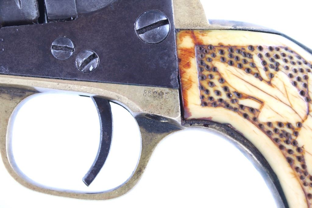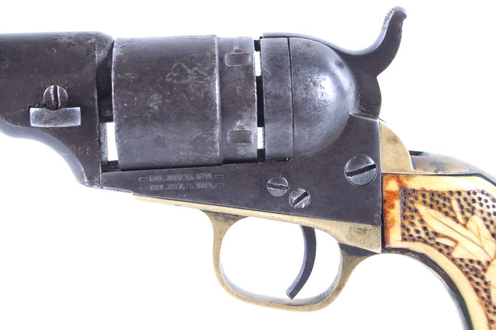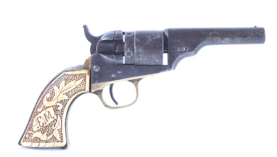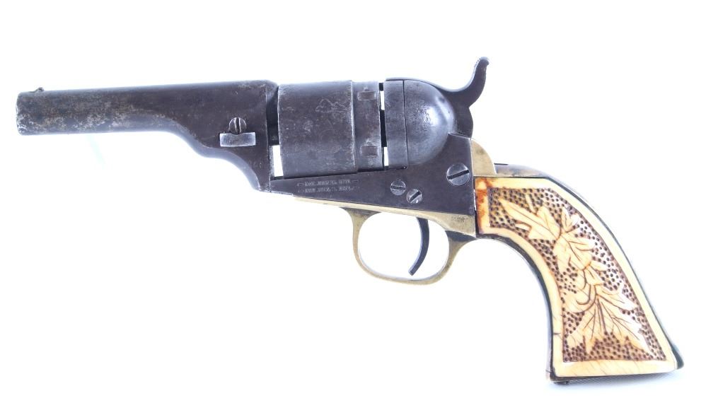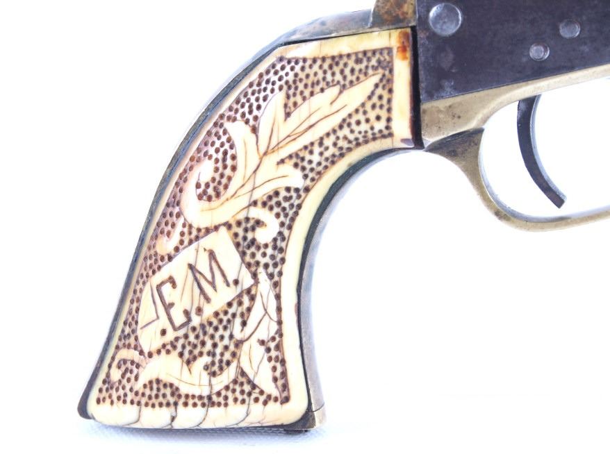 Featured in this lot is a Colt Model 1849 bone grip cartridge conversion revolver chambered in .36 caliber. The revolver was manufactured by Colt in the 1860s. This single action revolver displays a 3 1/2" long round barrel, five shot cylinder, carved bone grips, brass trigger guard, and brass back strap. The grip shows carved bone with a leaf pattern on each side with the right side engraved with the initials "E.M.". The barrel is marked across the top in faded letters marking it with "COLT'S PT F. A. MFG. CO HARTFORD CT. U.S.A." with the side of the frame marked with the patent dates and "36 CAL". The cylinder shows faded carriage attack scene with the revolver showing cartridge conversions. Mechanically, this revolver shows good condition with proper cylinder rotation. The piece shows good condition overall with wear across the exterior due to age and use. The pistol weighs 1lbs 6oz. Serial Number: 4458. This firearm qualifies as an antique, and does not require FFL Transfer or NICS Background Check.*