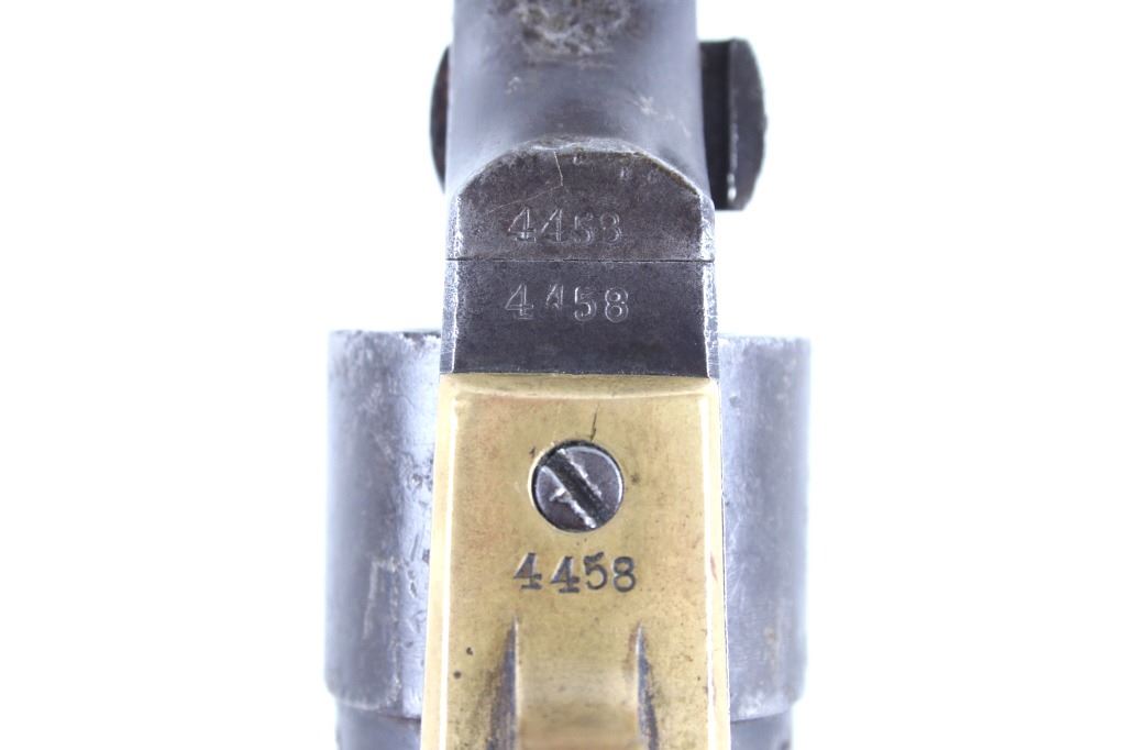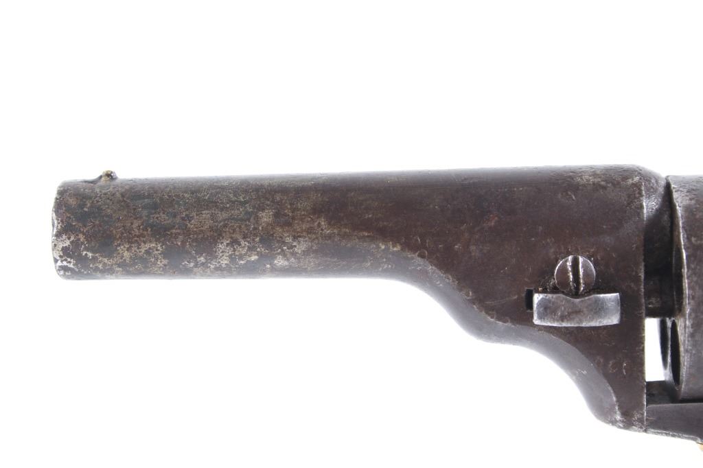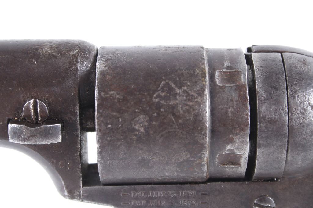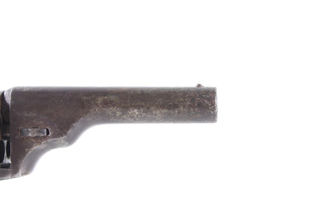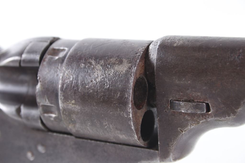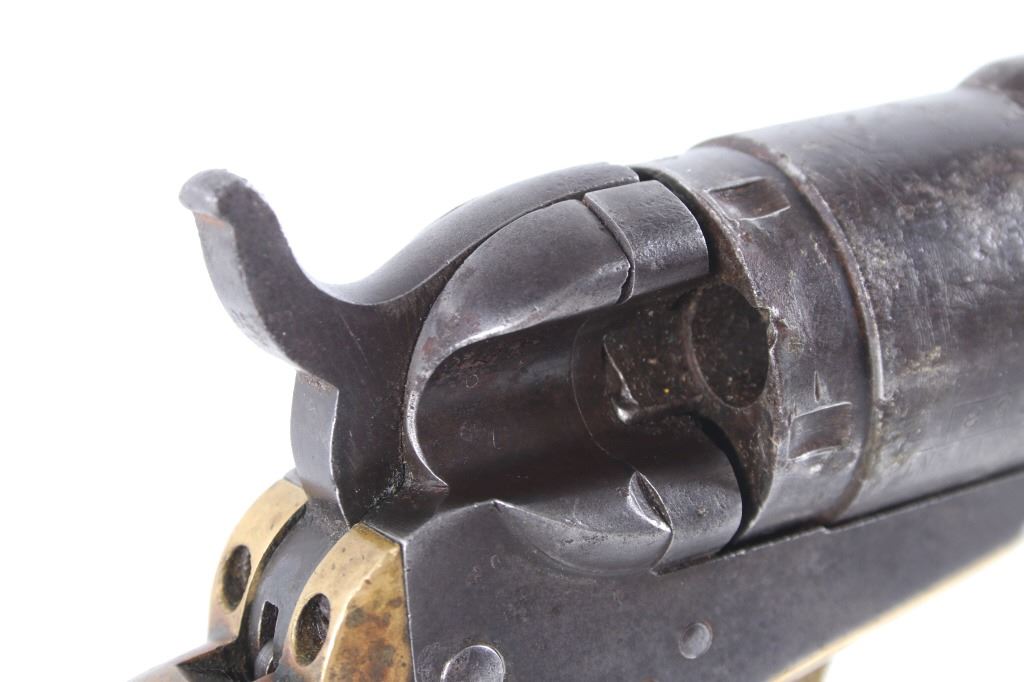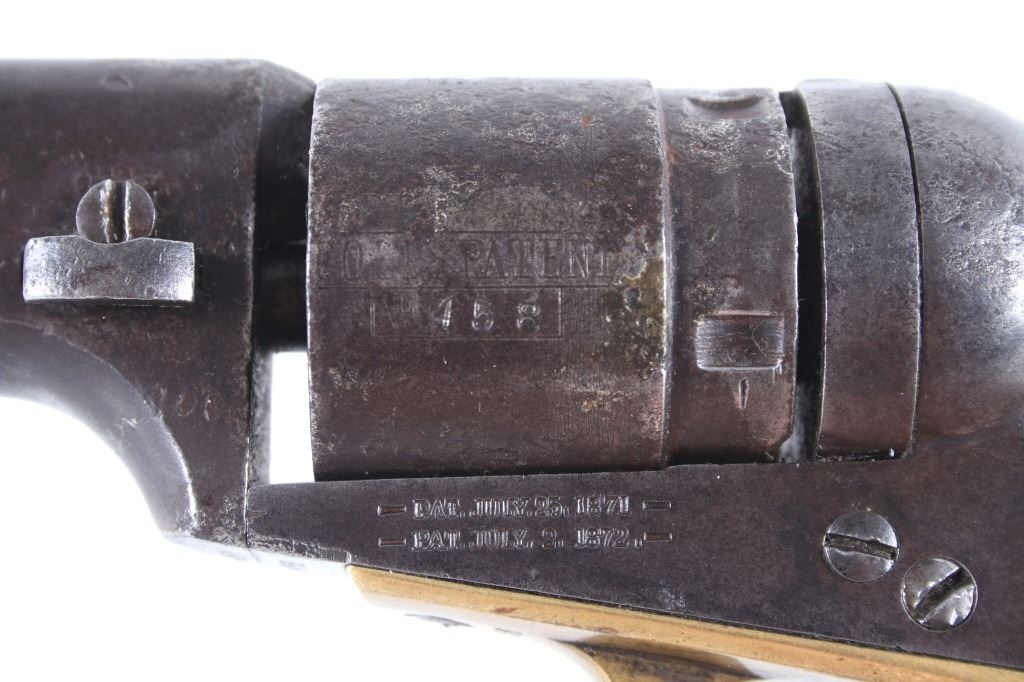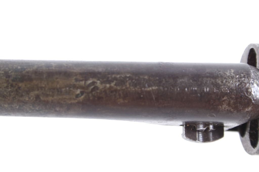 Featured in this lot is a Colt Model 1849 bone grip cartridge conversion revolver chambered in .36 caliber. The revolver was manufactured by Colt in the 1860s. This single action revolver displays a 3 1/2" long round barrel, five shot cylinder, carved bone grips, brass trigger guard, and brass back strap. The grip shows carved bone with a leaf pattern on each side with the right side engraved with the initials "E.M.". The barrel is marked across the top in faded letters marking it with "COLT'S PT F. A. MFG. CO HARTFORD CT. U.S.A." with the side of the frame marked with the patent dates and "36 CAL". The cylinder shows faded carriage attack scene with the revolver showing cartridge conversions. Mechanically, this revolver shows good condition with proper cylinder rotation. The piece shows good condition overall with wear across the exterior due to age and use. The pistol weighs 1lbs 6oz. Serial Number: 4458. This firearm qualifies as an antique, and does not require FFL Transfer or NICS Background Check.*