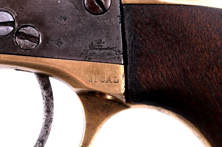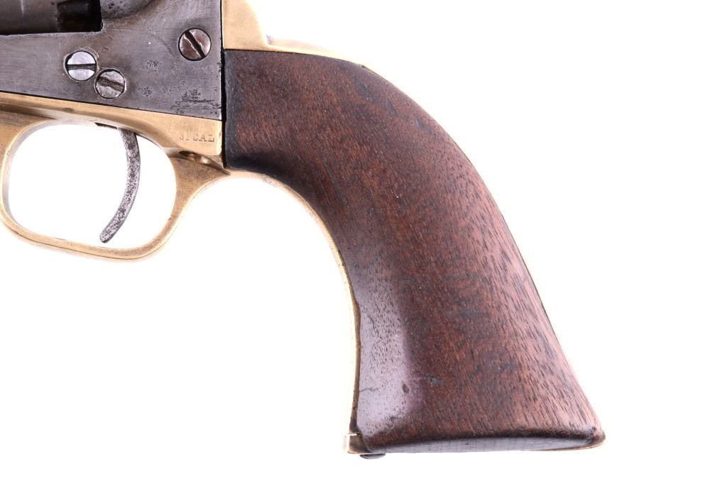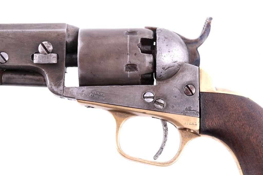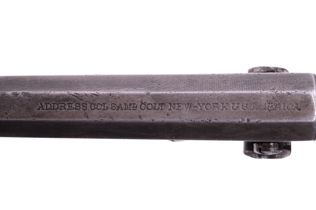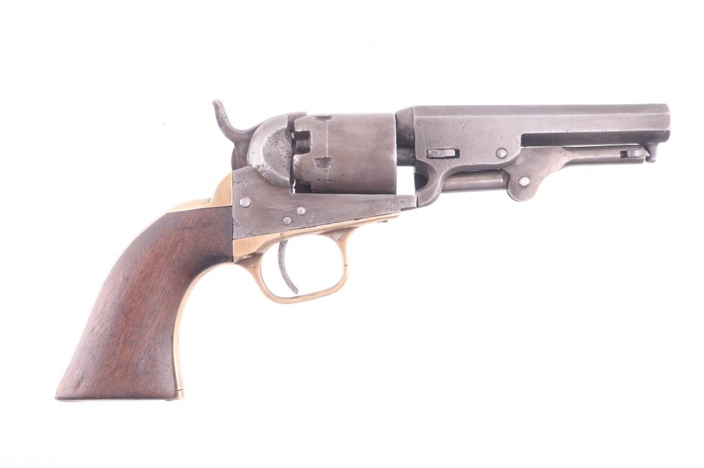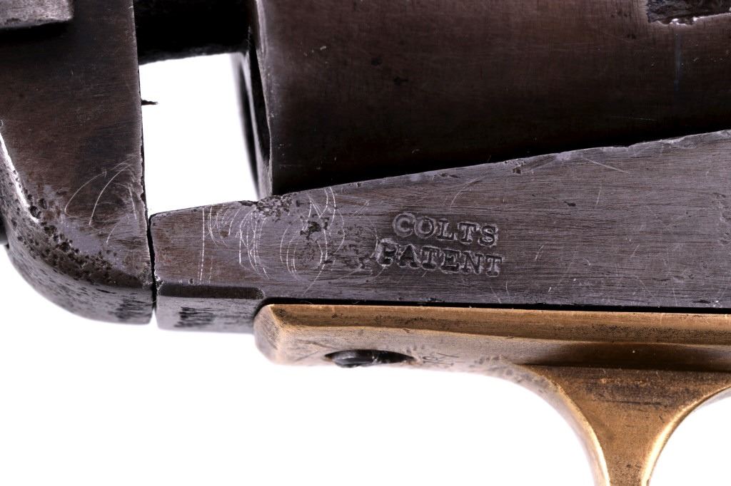 Colt Model 1849 Pocket Revolver with 4” octagon barrel and serial number 322187, indicating a scarce Post-Civil War manufacture date of 1870. This is a fine, original example .31 caliber, five-shot revolver that found favor with officers and enlisted men as personal weapons during the Indian Wars of the period. Many of these also saw service in the gold fields of California, the settling West, and in about all urban areas during this very turbulent time of Post-Civil War Reconstruction. The 1849 was one of Colt’s most popular designs that was large enough for aimed fire, but small enough to conceal in a waste band or unobtrusive holster. They also found favor with gamblers and “ladies of the evening.” The barrel is correctly marked “ADDRESS SAM’L COLT NEW-YORK US AMERICA”, along with “COLT’S PATENT” on the left side of the frame and “31 CAL.” on the side of the trigger guard. The revolver features nice, overall aged patina metal. Fine walnut grips show only normal light wear. This example also shows a mellow, uncleaned brass back strap and trigger guard. This revolver, with very attractive overall appearance, has all sharp markings, matching serial numbers, fine screws, and original loading lever. This is one of the most popular and successful of the Colt percussion revolvers and a key model for any Colt or Old West collection. Serial Number: 322187. This firearm qualifies as an Antique and does not require FFL Transfer or NICS Background Check.